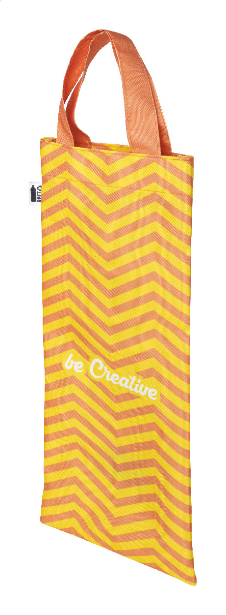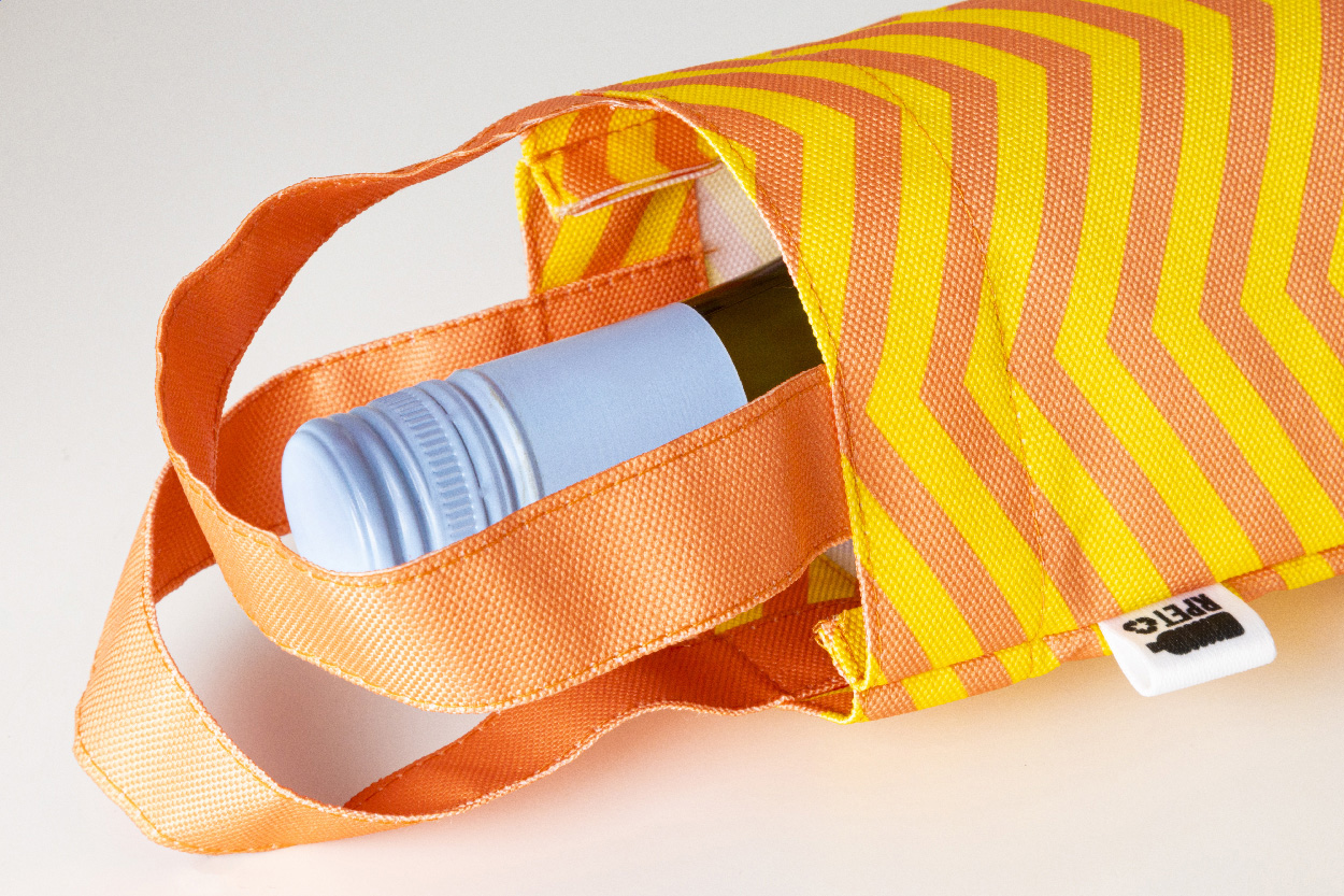 Individuelle Weintasche aus 600D RPET-Polyester mit kurzen Henkeln. Mit vollflächigem Sublimationsdruck. Mindestmenge: 25 Stk. Mit RPET-Label.