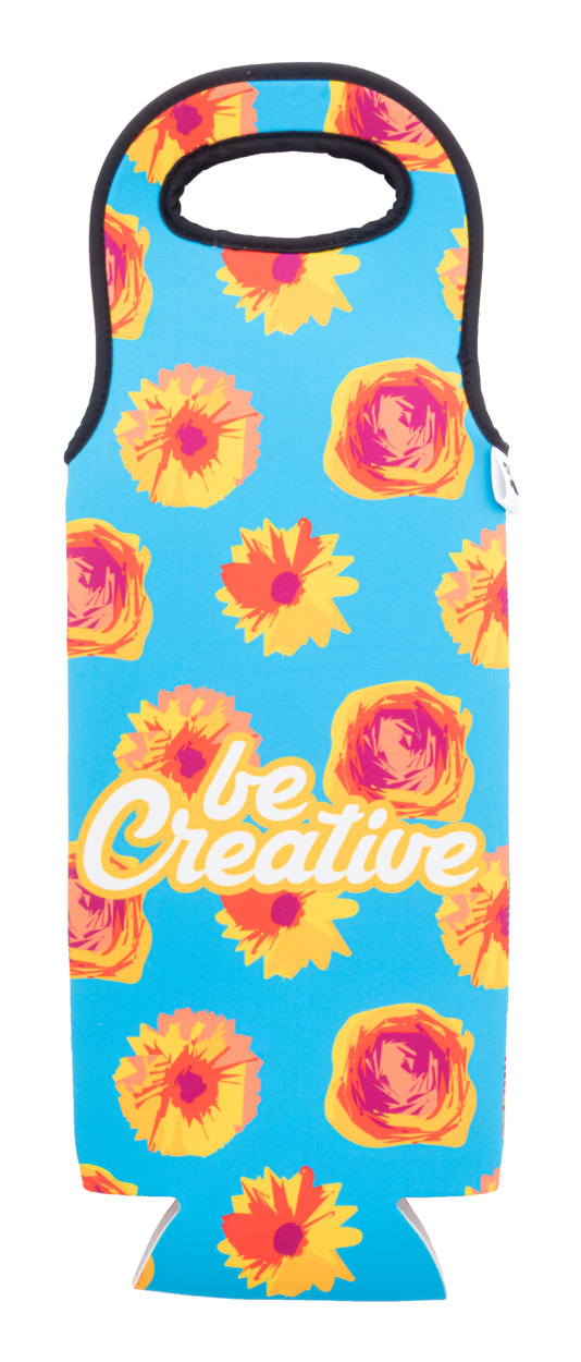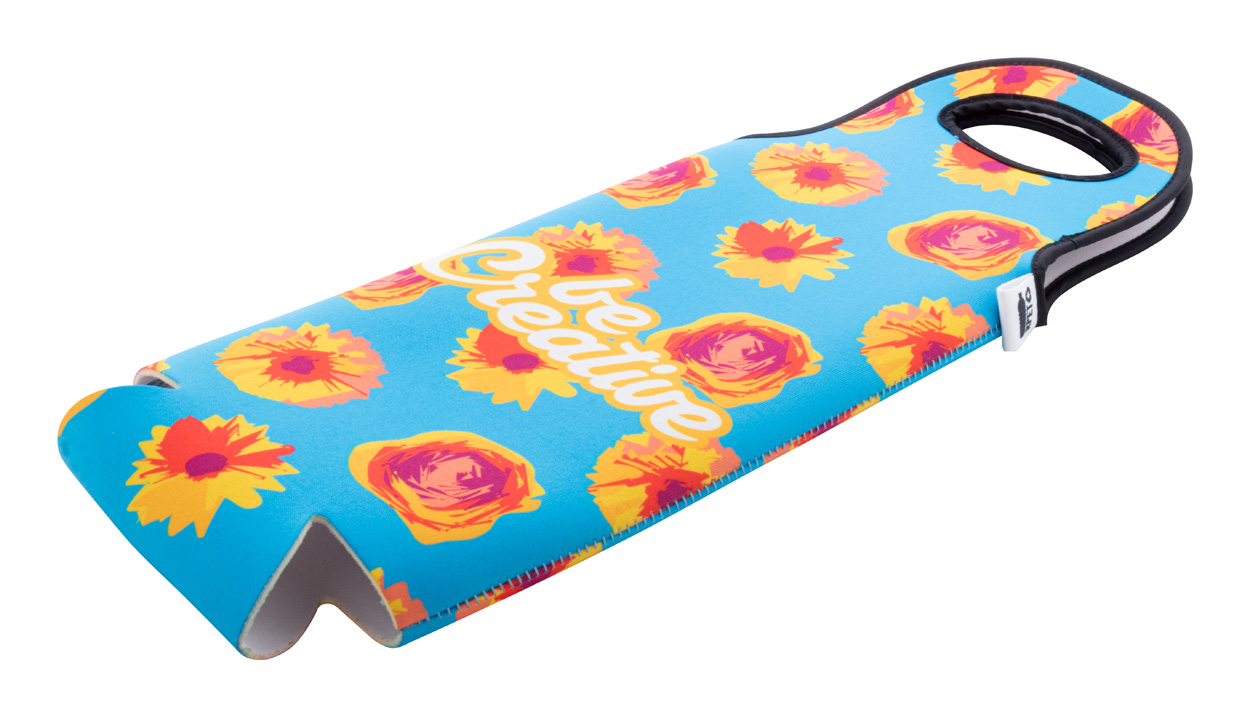 Individuelle Weinflaschentasche aus RPET Neopren mit Henkeln. Der Preis ist inkl. all-over Sublimationsdruck. Mindestmenge: 25 Stk.