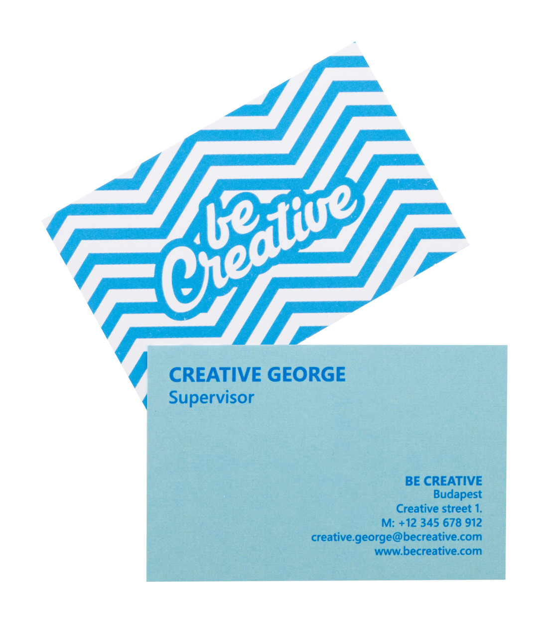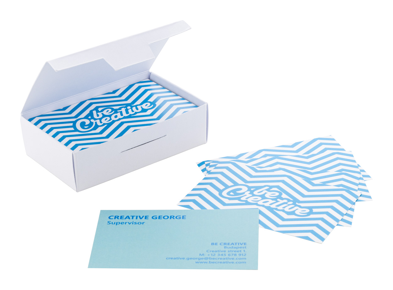 100 Stk. individuelle wasser- und reißfeste Visitenkarten mit vollfarbiger Bedruckung auf beiden Seiten. Verpackt in weißer Papierschachtel. Der angegebene Preis bezieht sich auf eine Schachtel mit 100 Stk. Visitenkarten.