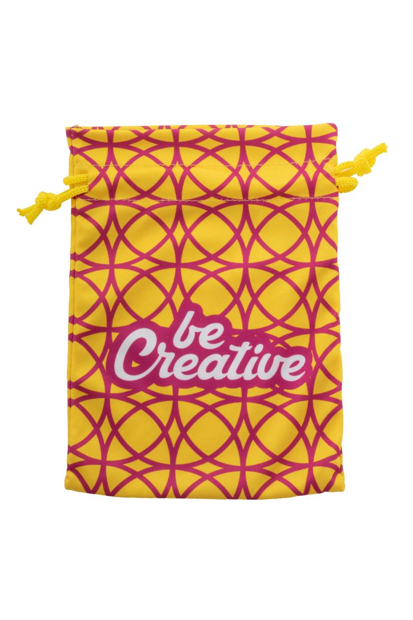 Individuell gestalteter mittelgroßer Kordelzug-Geschenkbeutel mit farbiger Schnur.