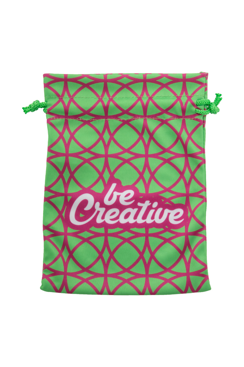 Individuell gestalteter mittelgroßer Kordelzug-Geschenkbeutel mit farbiger Schnur.