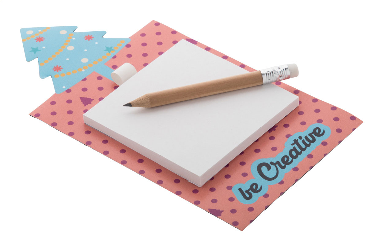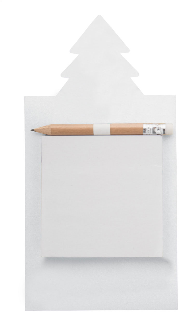 Individueller vollfarbig bedruckter Kühlschrankmagnet mit Weihnachtsbaummotiv, Haftnotizblock (75 x 75 mm) mit 50 Haftnotizen aus Recyclingpapier und Mini-Holzbleistift. Mindestmenge: 100 Stück.