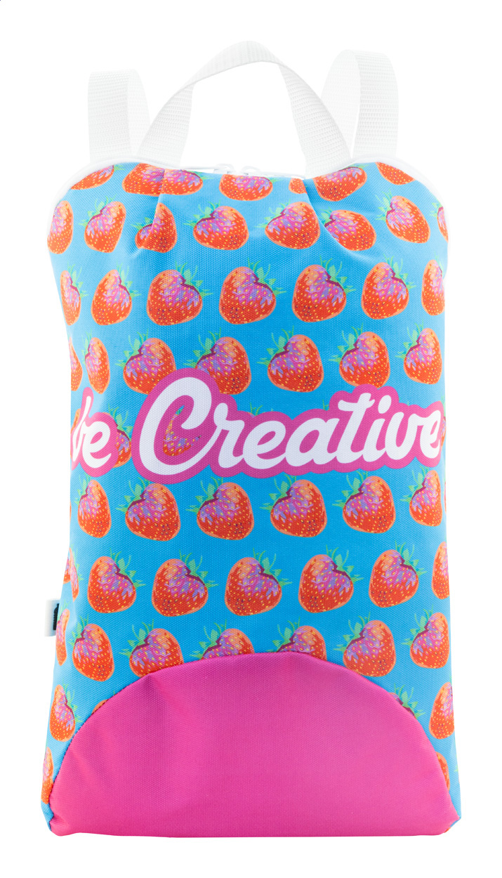 Individueller RPET-Mini-Rucksack mit Reißverschlussfach. Mit vollflächigem Sublimationsdruck. Material: 600D RPET-Polyester. Mit RPET-Label. Mindestmenge: 25 Stk.