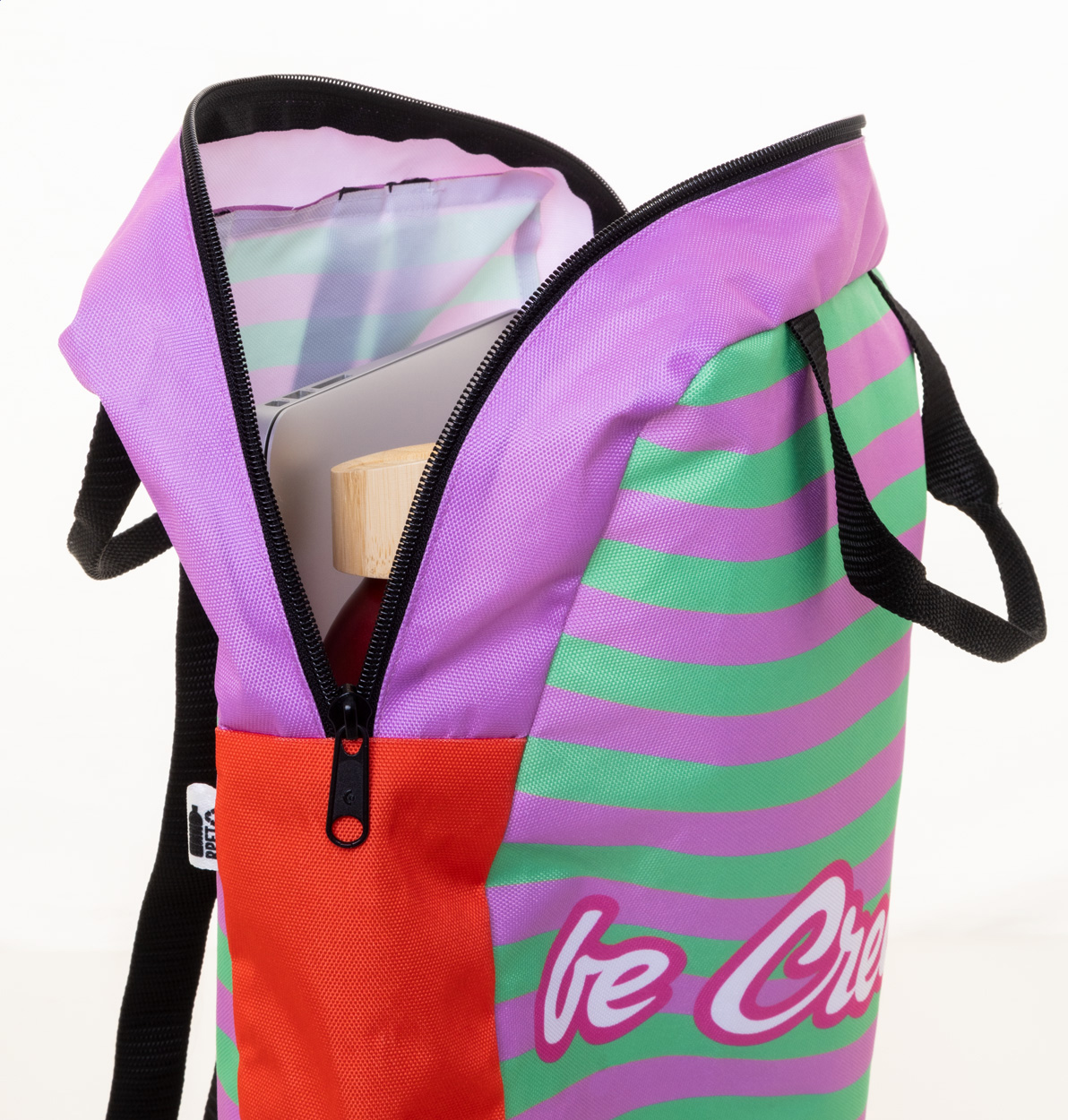 Indivdueller schlanker RPET-Rucksack mit Laptop-Fach (15") mit Reißverschluss. Mit vollflächigem Sublimationsdruck. Material: 600D RPET-Polyester. Mit RPET-Label. Mindestmenge: 25 Stk.