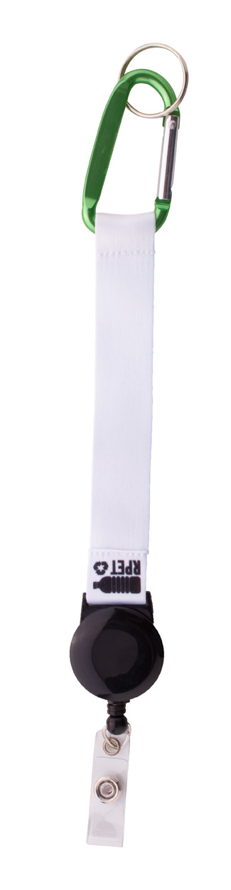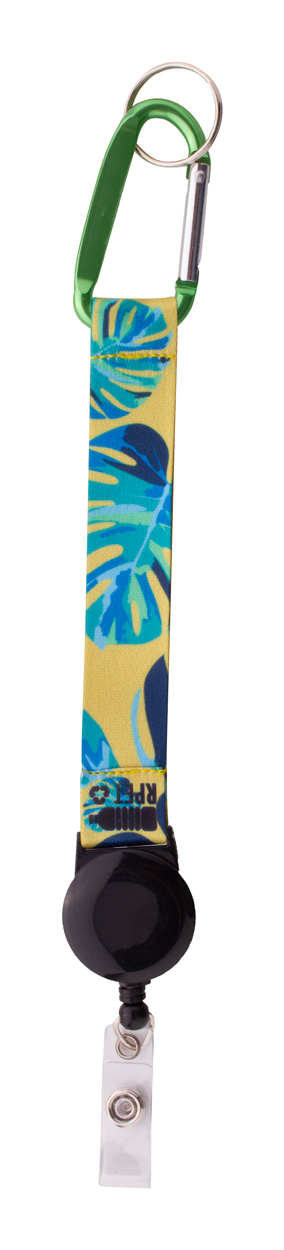 Individueller Schlüsselanhänger aus RPET-Polyester mit ausziehbarem Ausweishalter, Aluminiumkarabiner und Schlüsselring aus Metall. Preis inkl. Sublimationsdruck auf beiden Seiten sowie RPET-Label. Mindestmenge: 100 Stk.