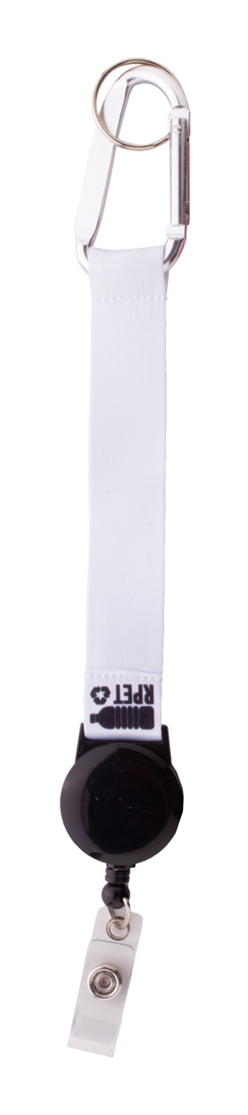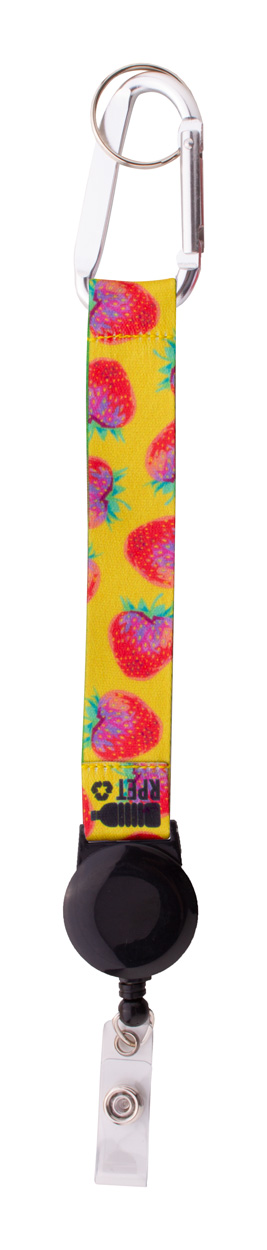 Individueller Schlüsselanhänger aus RPET-Polyester mit ausziehbarem Ausweishalter, Aluminiumkarabiner und Schlüsselring aus Metall. Preis inkl. Sublimationsdruck auf beiden Seiten sowie RPET-Label. Mindestmenge: 100 Stk.