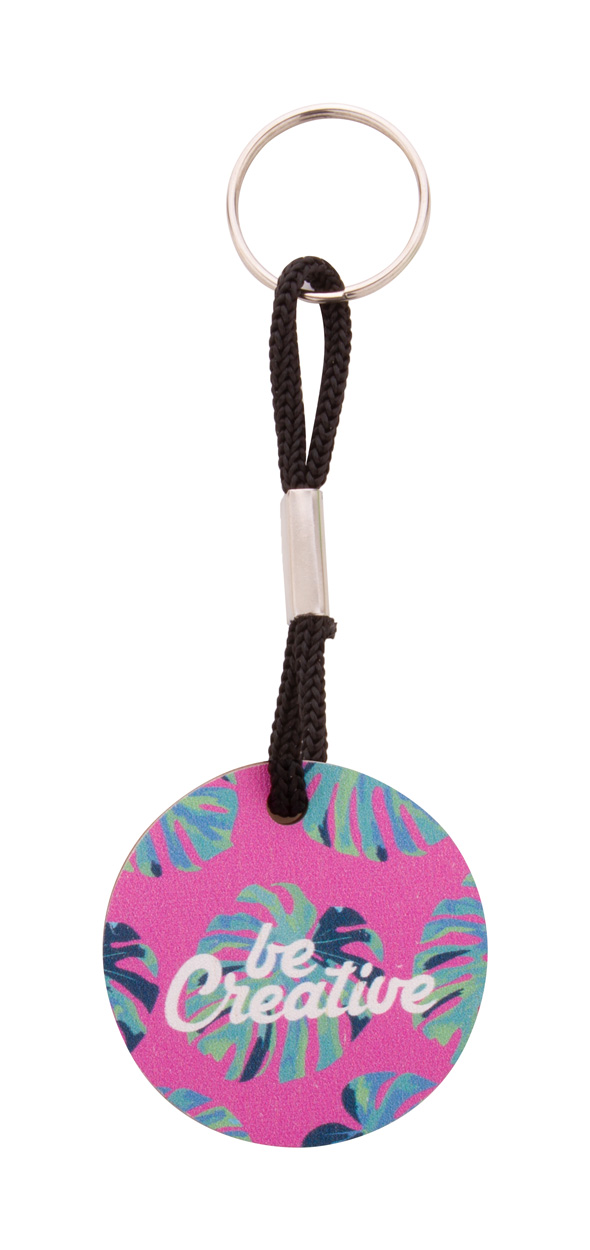 Runder Schlüsselanhänger aus Birkensperrholz mit farbigem Band aus Polyester und Vollfarbdruck. Der Preis ist inkl. UV Druck auf einer Seite. Mindestmenge: 200 Stk.