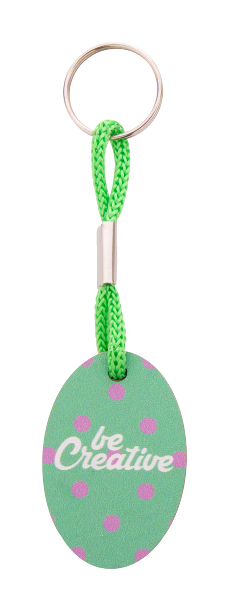 Ovaler Schlüsselanhänger aus Birkensperrholz mit farbigem Band aus Polyester und Vollfarbdruck. Der Preis ist inkl. UV Druck auf einer Seite. Mindestmenge: 200 Stk.