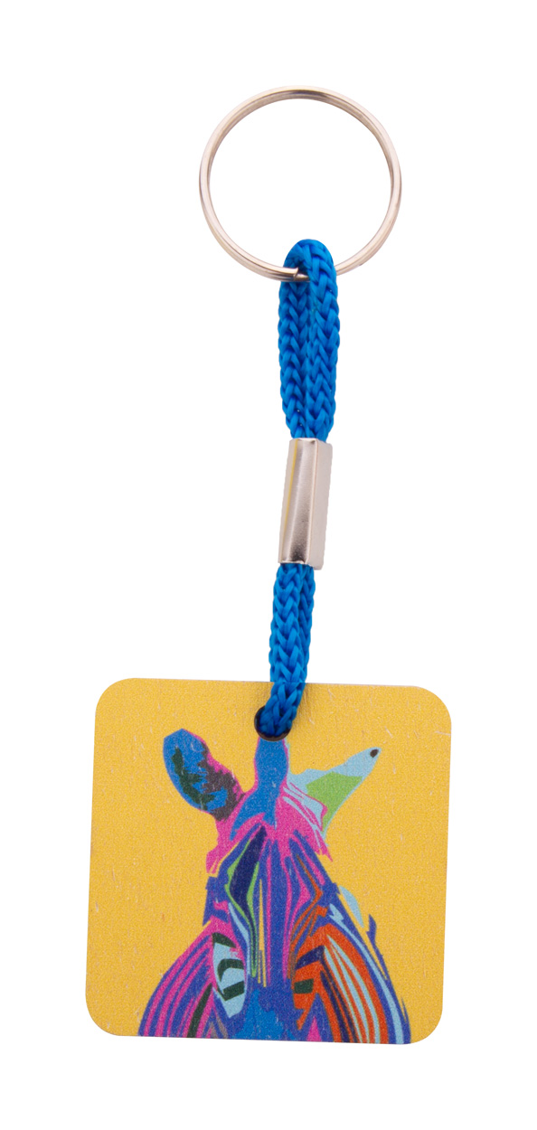 Quadratischer Schlüsselanhänger aus Birkensperrholz mit farbigem Band aus Polyester und Vollfarbdruck. Der Preis ist inkl. UV Druck auf einer Seite. Mindestmenge: 200 Stk.