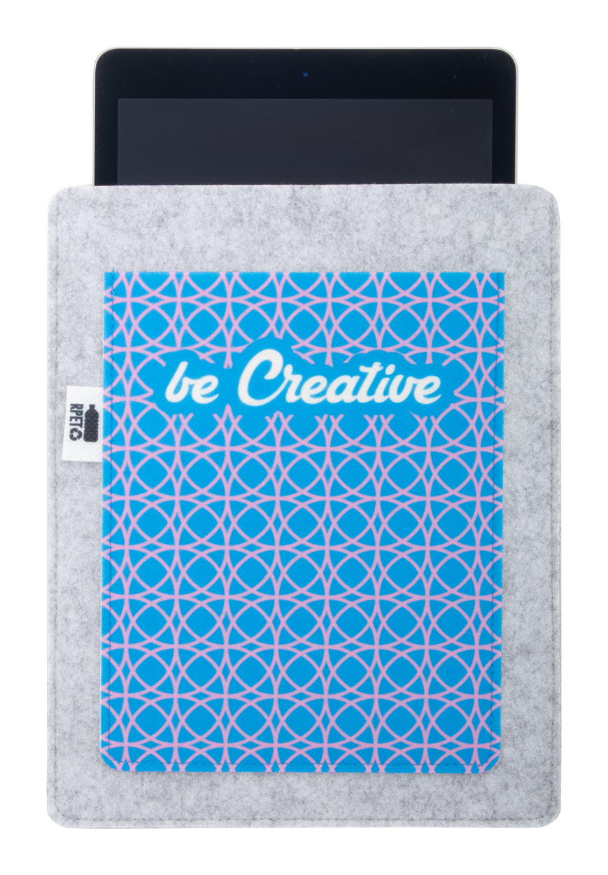 Individueller Tablethalter aus RPET Filz (mit RPET Label) mit einer vollfarbig bedruckter Vordertasche. Passend für Tablets bis zu einer Größe von 11". Der Preis ist inkl. Sublimationsdruck. Mindestmenge: 25 Stk.