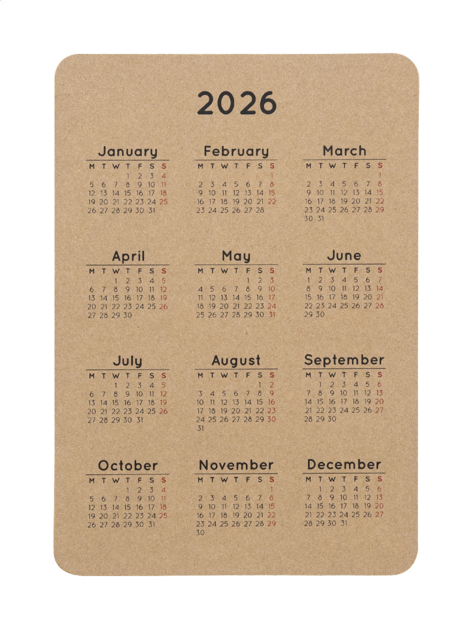 Individueller Kalender aus Kraftpapier (300 g / m²) im Taschenformat. Der Preis ist inkl. beidseitigem Digitaldruck. Mindestmenge: 250 Stk.