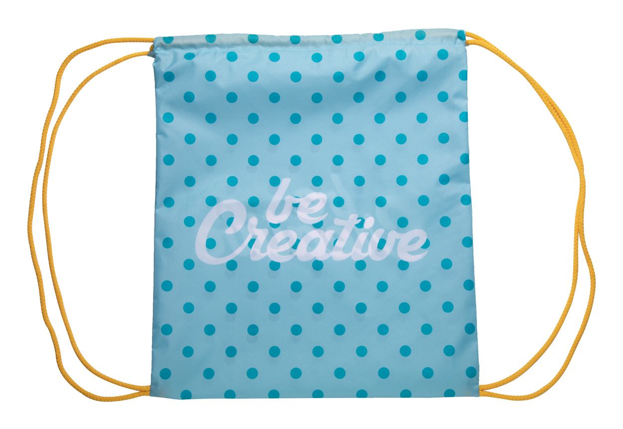 Individueller Turnbeutel mit farbigen Zugkordeln. Material: 190T Polyester. Der Preis ist inkl. vollflächigem Sublimationsdruck. Mindestmenge: 25 Stk.
