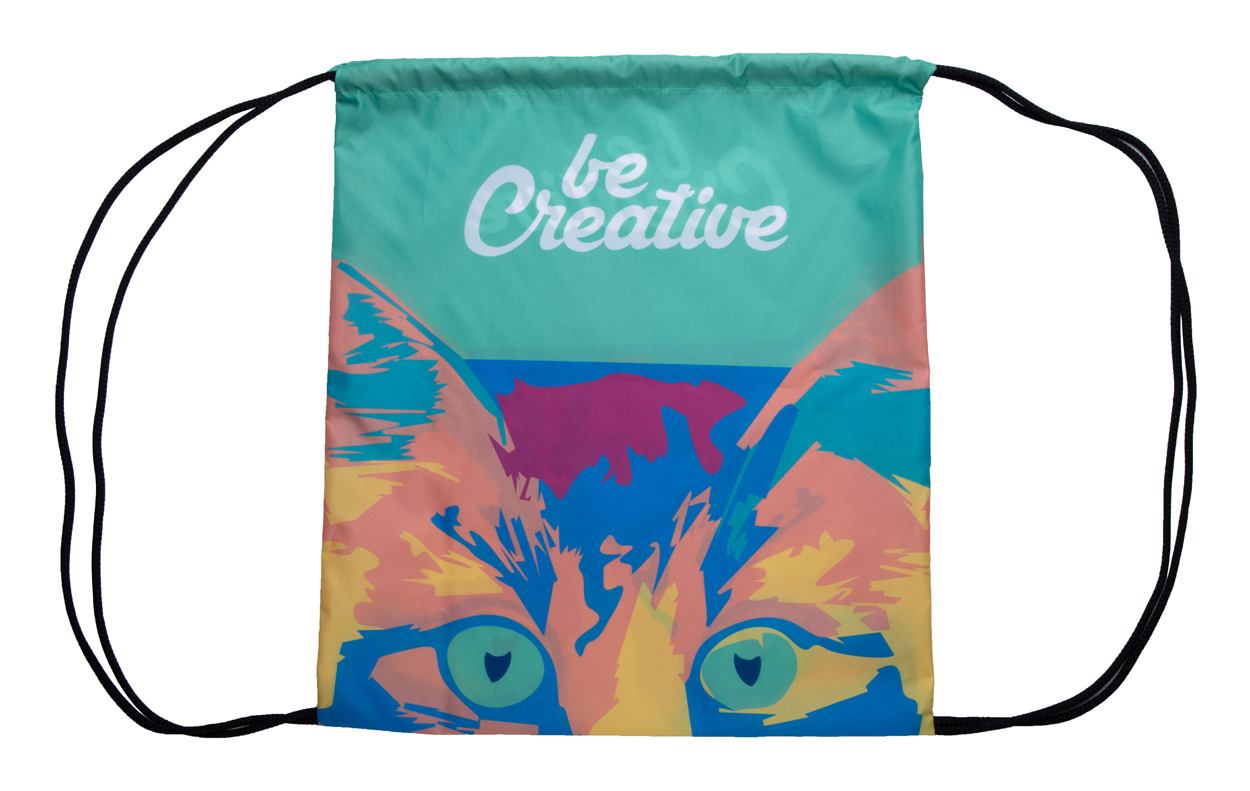 Individueller Turnbeutel mit farbigen Zugkordeln. Material: 190T Polyester. Der Preis ist inkl. vollflächigem Sublimationsdruck. Mindestmenge: 25 Stk.