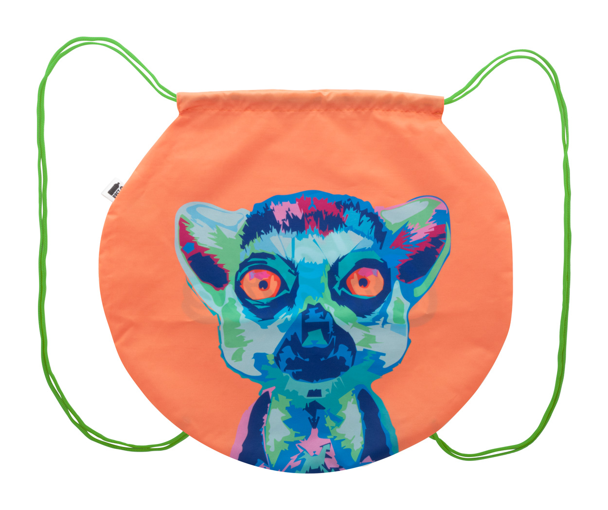 Individueller, ballförmiger Beutel mit Kordelzug und farbigen Kordeln, 190T RPET-Polyester. Mit vollflächigem Sublimationsdruck und RPET-Label. Mindestmenge: 25 Stück.
