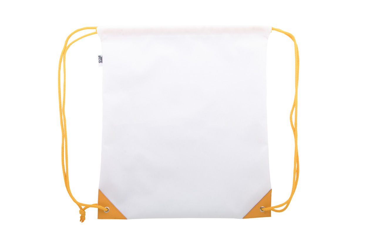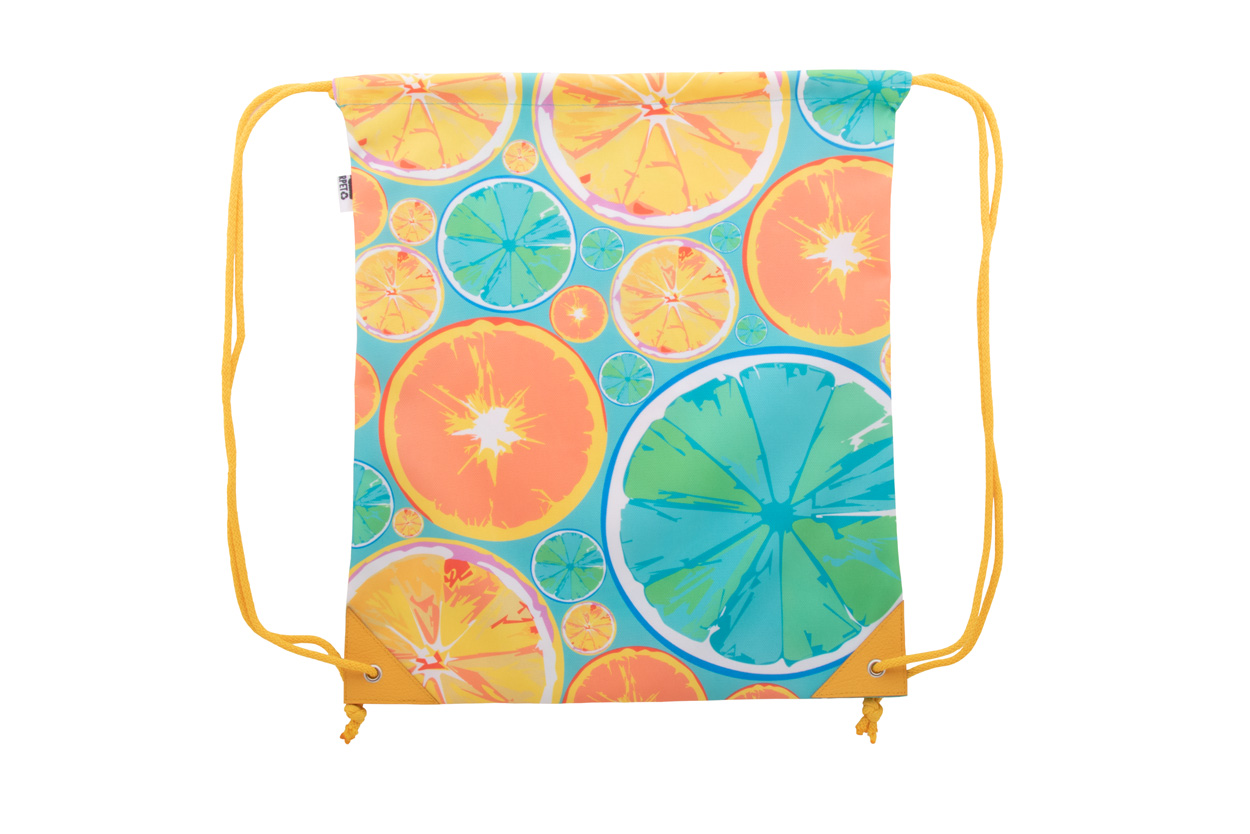 Individueller Turnbeutel aus 600D RPET Polyester mit verstärkten Ecken aus Kunstleder und dicken, farblich abgestimmten Kordeln. Inklusive vollflächigem Sublimationsdruck und RPET-Label. Mindestmenge: 25 Stk.