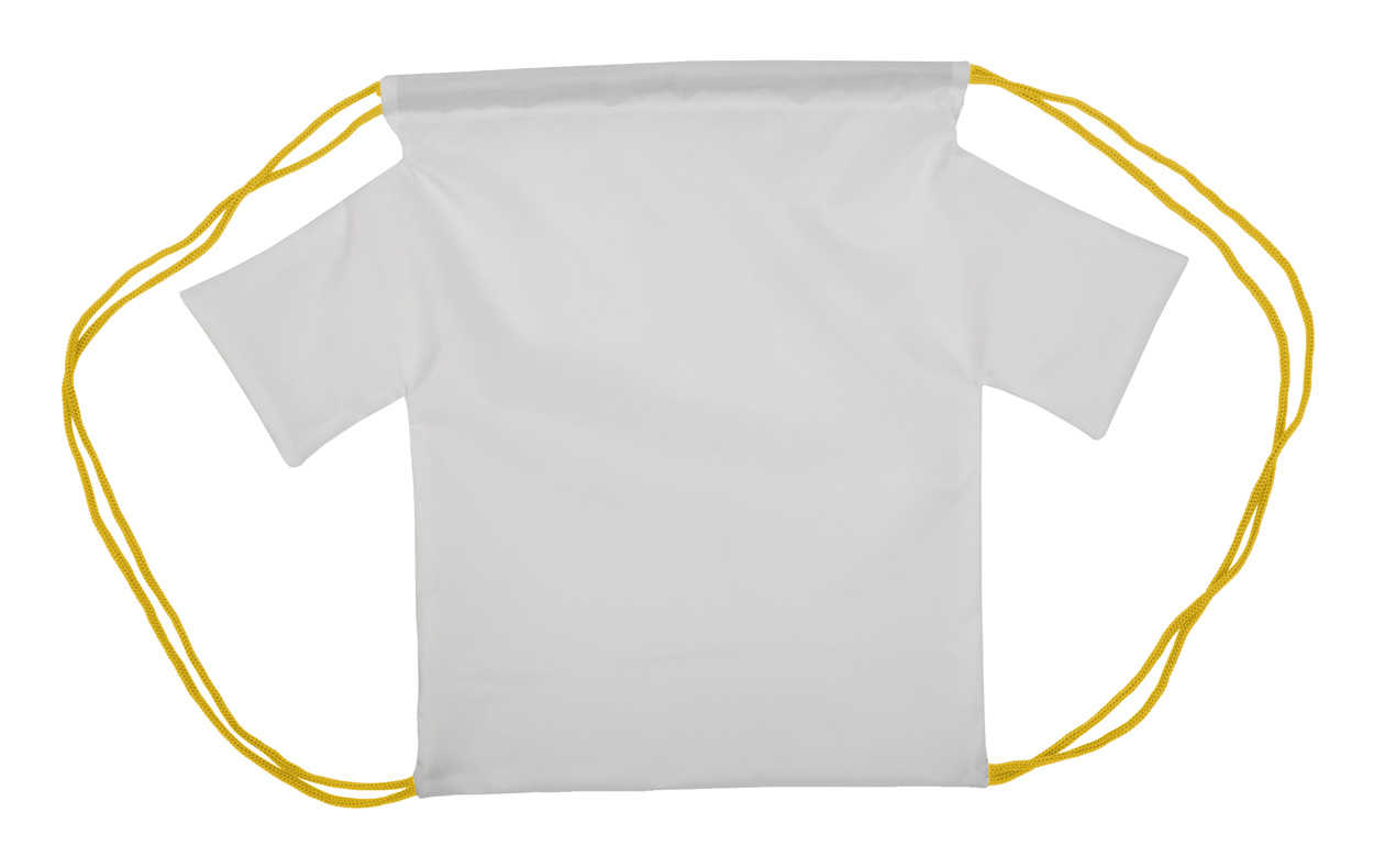 Individueller Turnbeutel in T-Shirt-Design mit farbigen Zugkordeln und vollflächigem Sublimationsdruck. Material: 190T Polyester. Mindestmenge: 25 Stk.