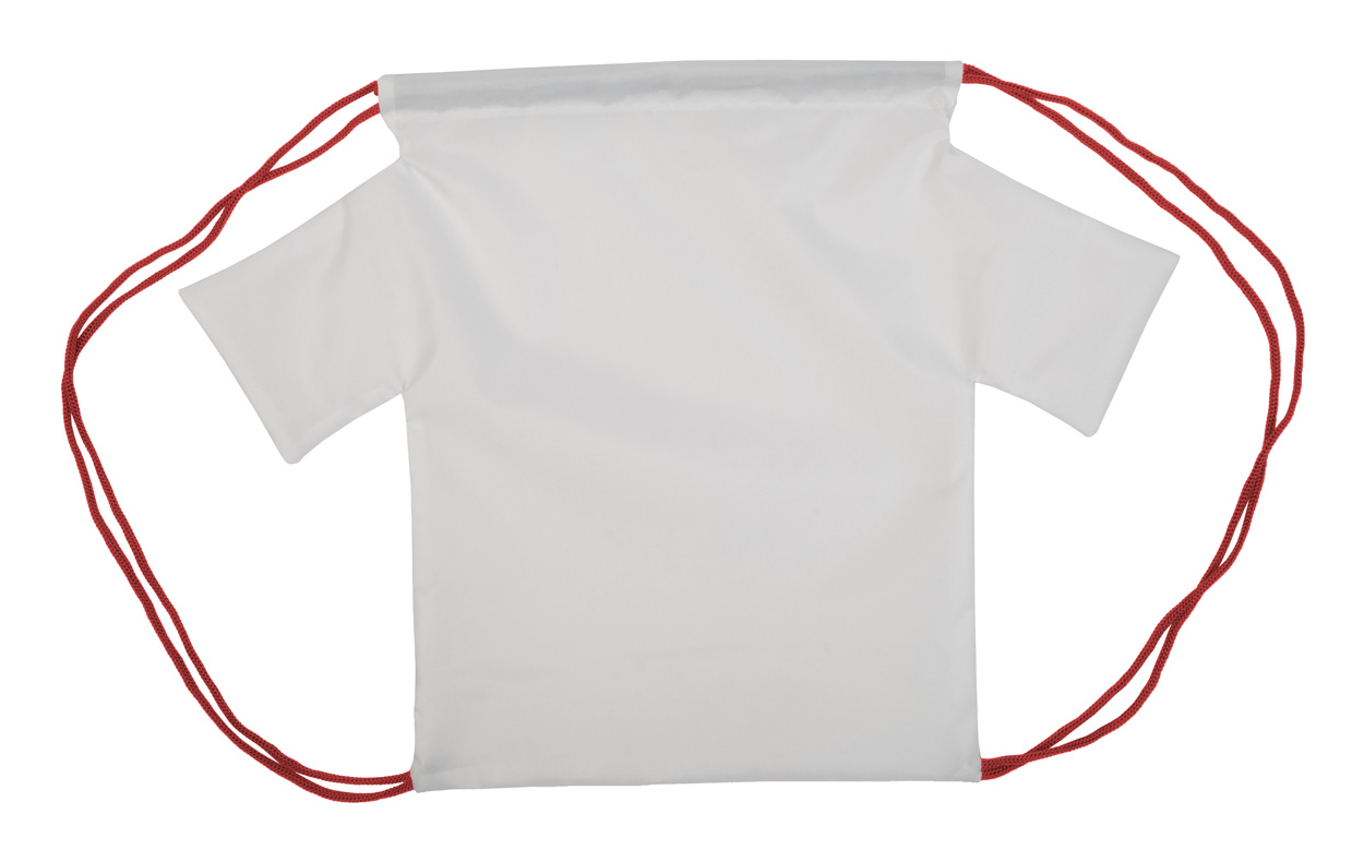 Individueller Turnbeutel in T-Shirt-Design mit farbigen Zugkordeln und vollflächigem Sublimationsdruck. Material: 190T Polyester. Mindestmenge: 25 Stk.