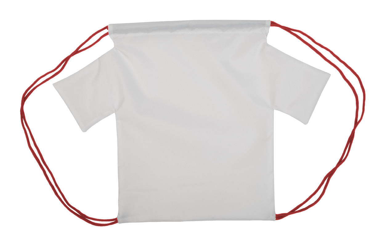Individuelles Turnbeutel in T-Shirt-Form für Kinder mit farbigen Kordeln, Material: 190T Polyester. Der Preis ist inkl. vollflächigem Sublimationsdruck. Mindestmenge: 25 Stk.