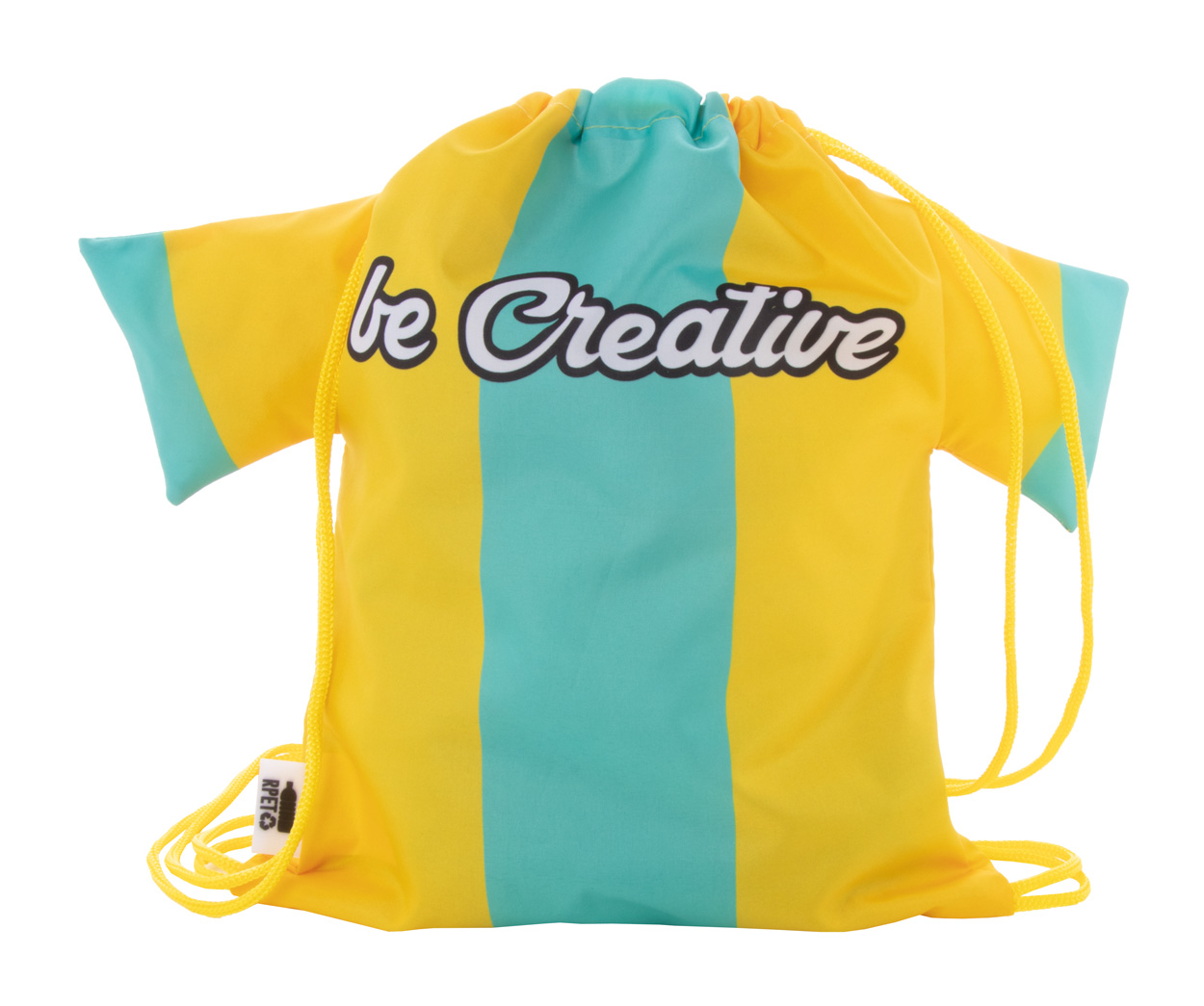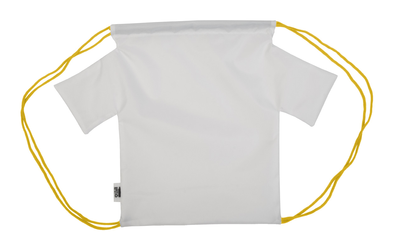 Individuelles Turnbeutel in T-Shirt-Form für Kinder mit farbigen Kordeln, Material: 190T Polyester. Der Preis ist inkl. vollflächigem Sublimationsdruck sowie RPET-Label. Mindestmenge: 25 Stk.
