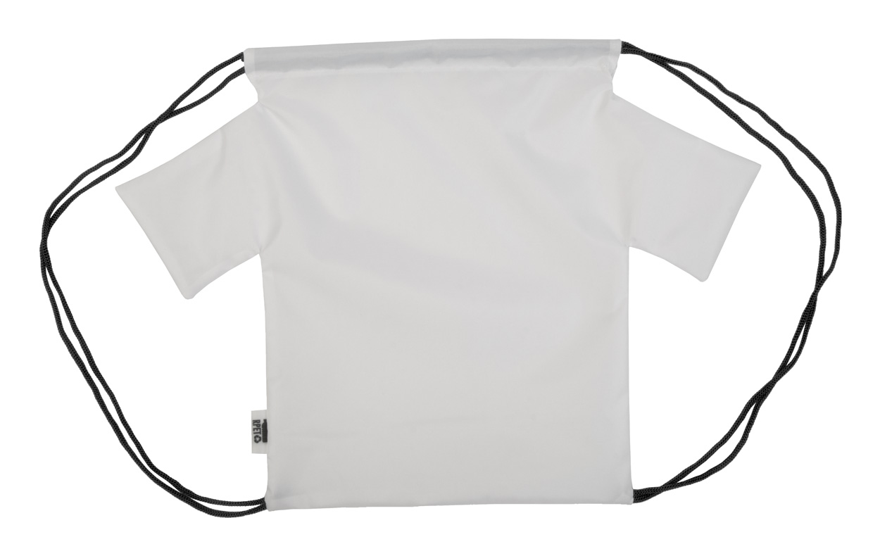 Individueller Turnbeutel in T-Shirt-Design mit farbigen Zugkordeln und vollflächigem Sublimationsdruck. Material: 190T RPET Polyester. Mindestmenge: 25 Stk.