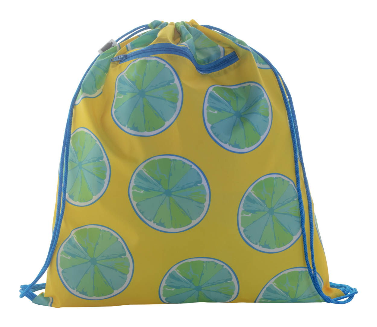 Individueller Turnbeutel mit Zugkordeln, mit Reißverschlusstasche vorne, Material: 190T RPET. Der Preis ist inkl. vollflächigem Sublimationsdruck. Mindestmenge: 25 Stk.