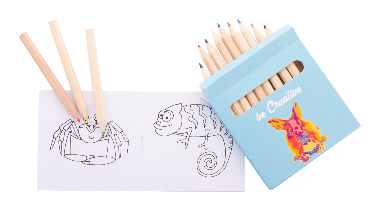 Individuelles Ausmalset in einer vollfarbig bedruckter Pappschachtel. Das Set beinhaltet Holzbuntstifte (12 Stk.) und ein Themenmalbuch. Mindestmenge: 100 Stk.