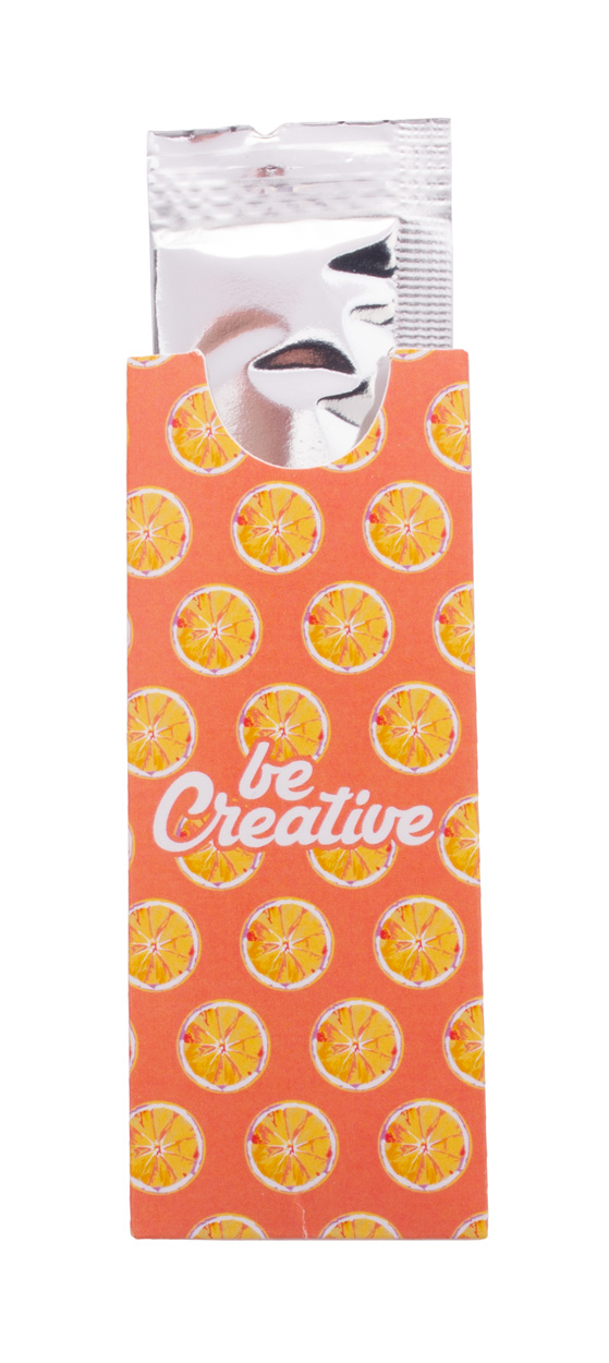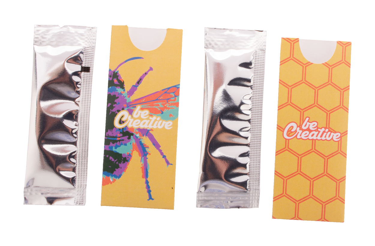 Eine Einzelportion Honig (10 g) in individuellem, vollfarbig bedrucktem Briefchen. Mindestmenge: 100 Stk.