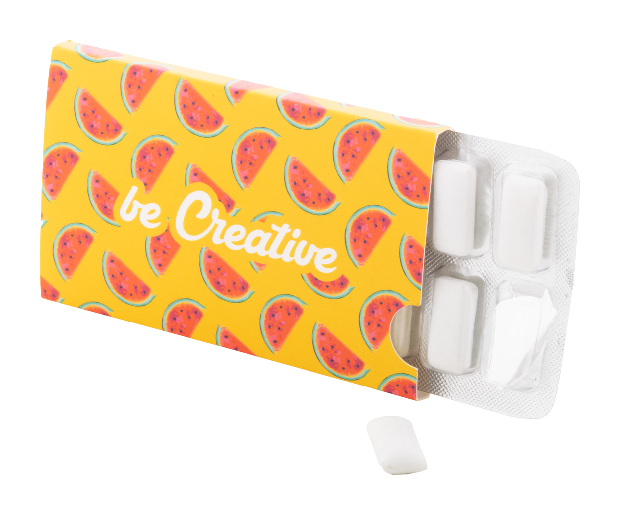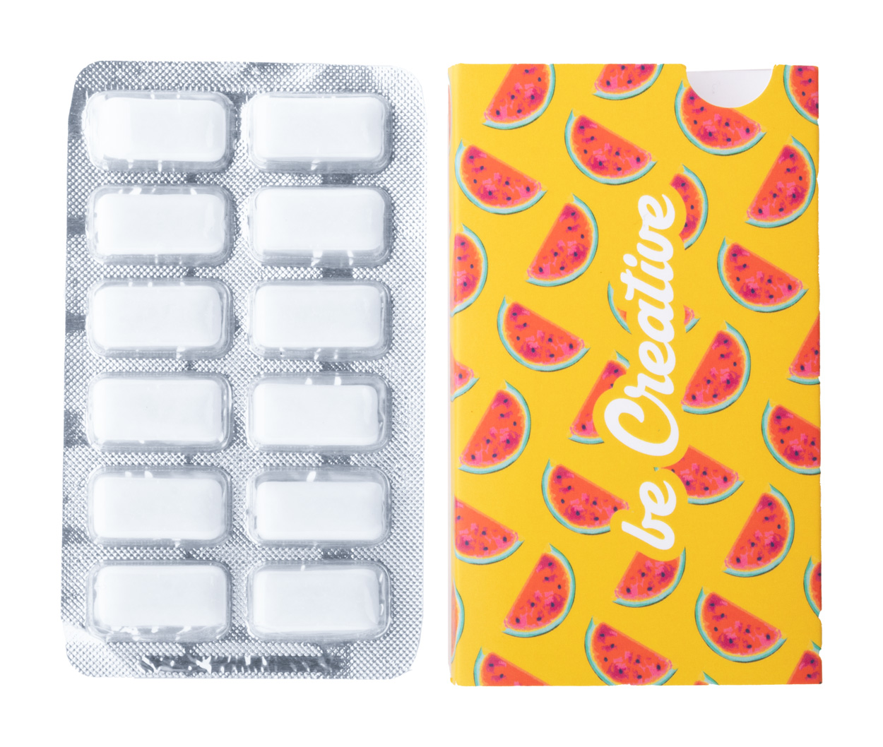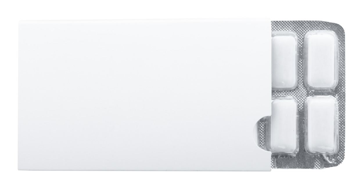 12 Stück zuckerfreie Kaugummis im Blister mit speziell angefertigter, vollfarbig bedruckter Papierhülle. Mindestbestellmenge: 100 Stück.