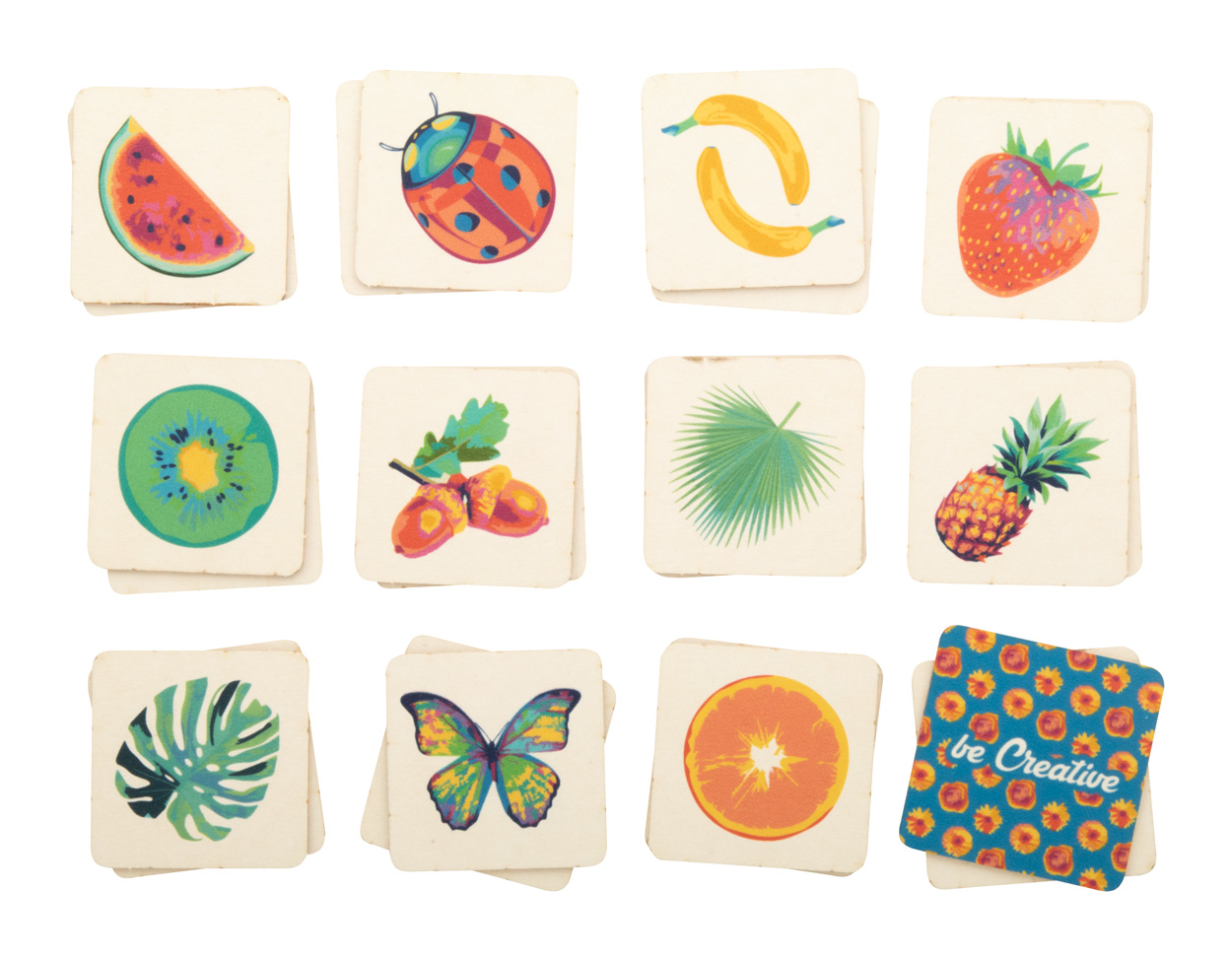 Memory-Spiel aus Pappe mit individuellen Motiven. Das Spiel besteht aus 24 Teilen (40 x 40 mm). Der Preis ist inklusive 12 unterschiedlichen Motiven (CMYK) auf der Vorderseite (je zwei Spielsteine) und einem CMYK-Logodruck auf der Rückseite auf allen Spielsteinen. Mindestmenge: 250 Stk.
