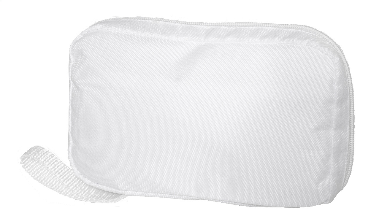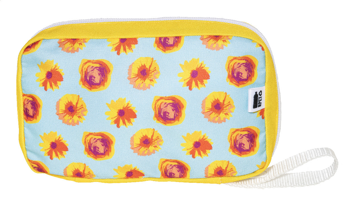 Individuelle Kabelorganizer-Tasche aus RPET mit Reißverschluss und Netzinnenfächern. Mit vollflächigem Sublimationsdruck. Material: 600D RPET-Polyester. Mindestmenge: 25 Stk. Mit RPET-Label.