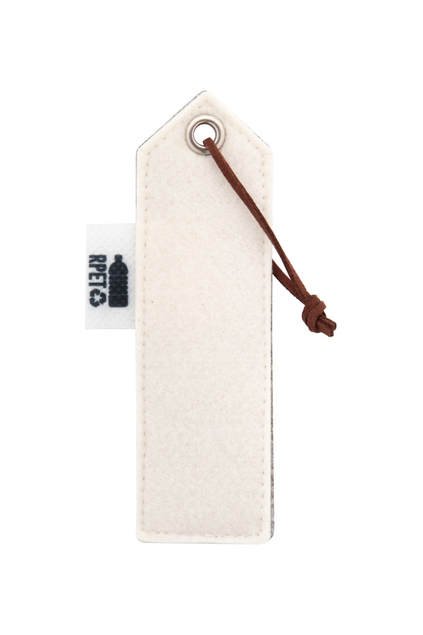 Individuelles Lesezeichen aus RPET-Filz mit vollfarbig bedruckter Vorderseite und PU-Lederband. Mit markantem RPET-Label. Der Preis beinhaltet den Sublimationsdruck. Mindestbestellmenge: 100 Stück.