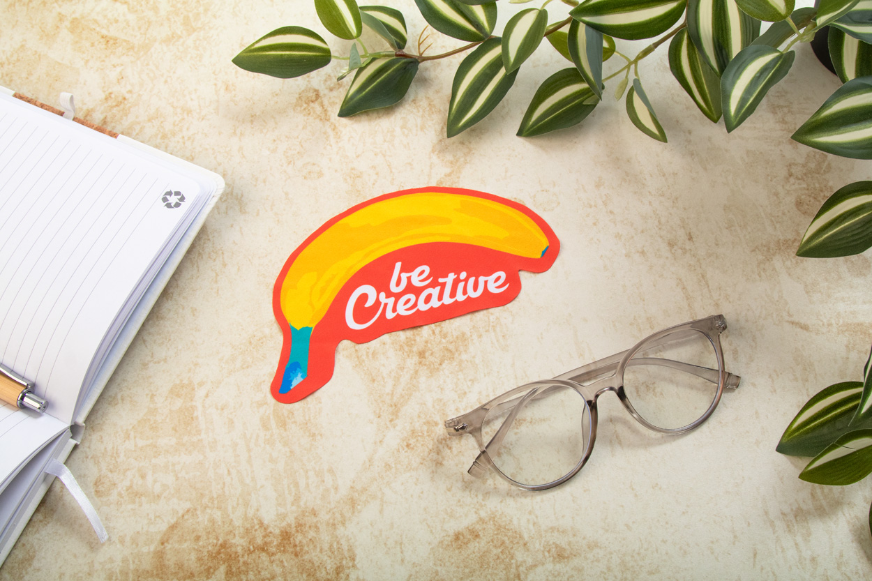 Individuelles Brillen- und Bildschirmreinigungstuch aus RPET Mikrofaser (170 g / m²). Produziert in eizigartiger Form mit Sublimationsdruck auf einer Seite. Mindestmenge: 100 Stk.