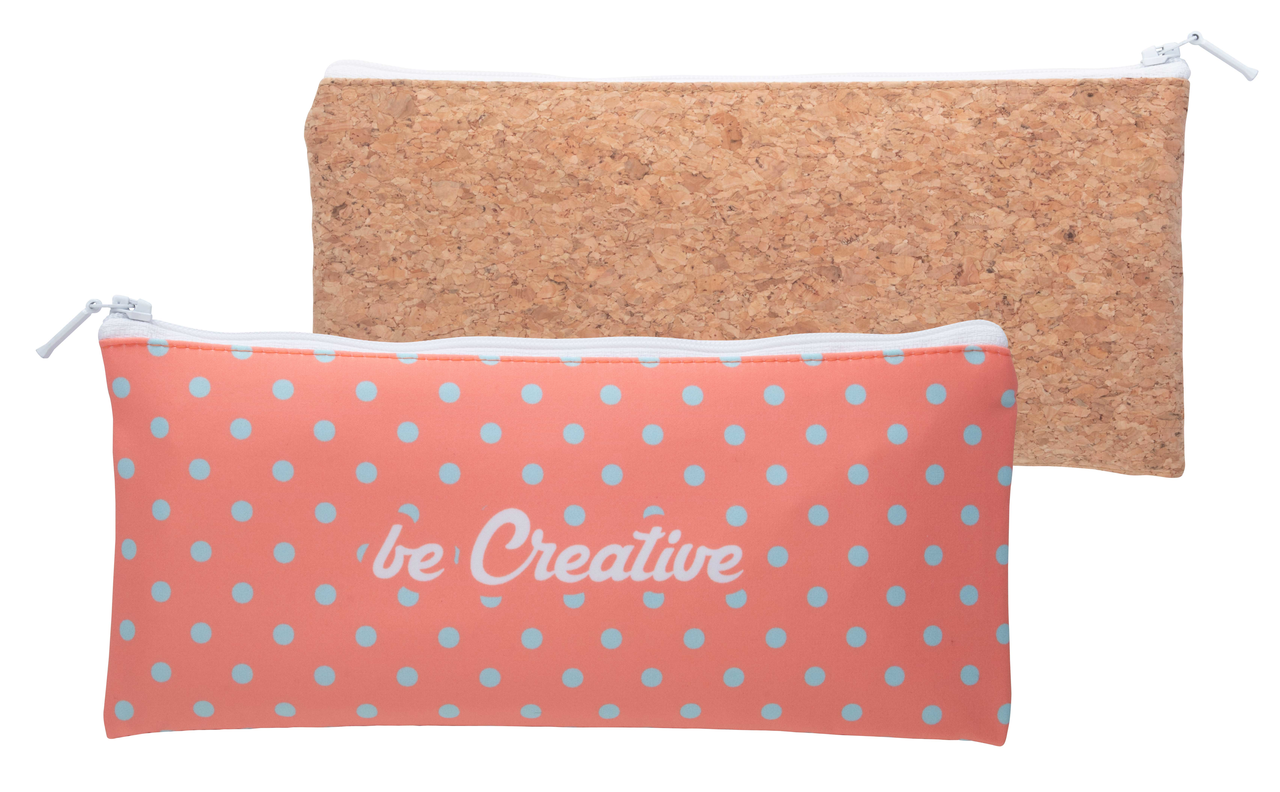 Individuelle Reißverschluss-Stiftetasche aus Polyester mit Rückseite aus natürlichem Kork. Der Preis ist inkl. Sublimationsdruck auf der Vorderseite. Mindestmenge: 50 Stk.