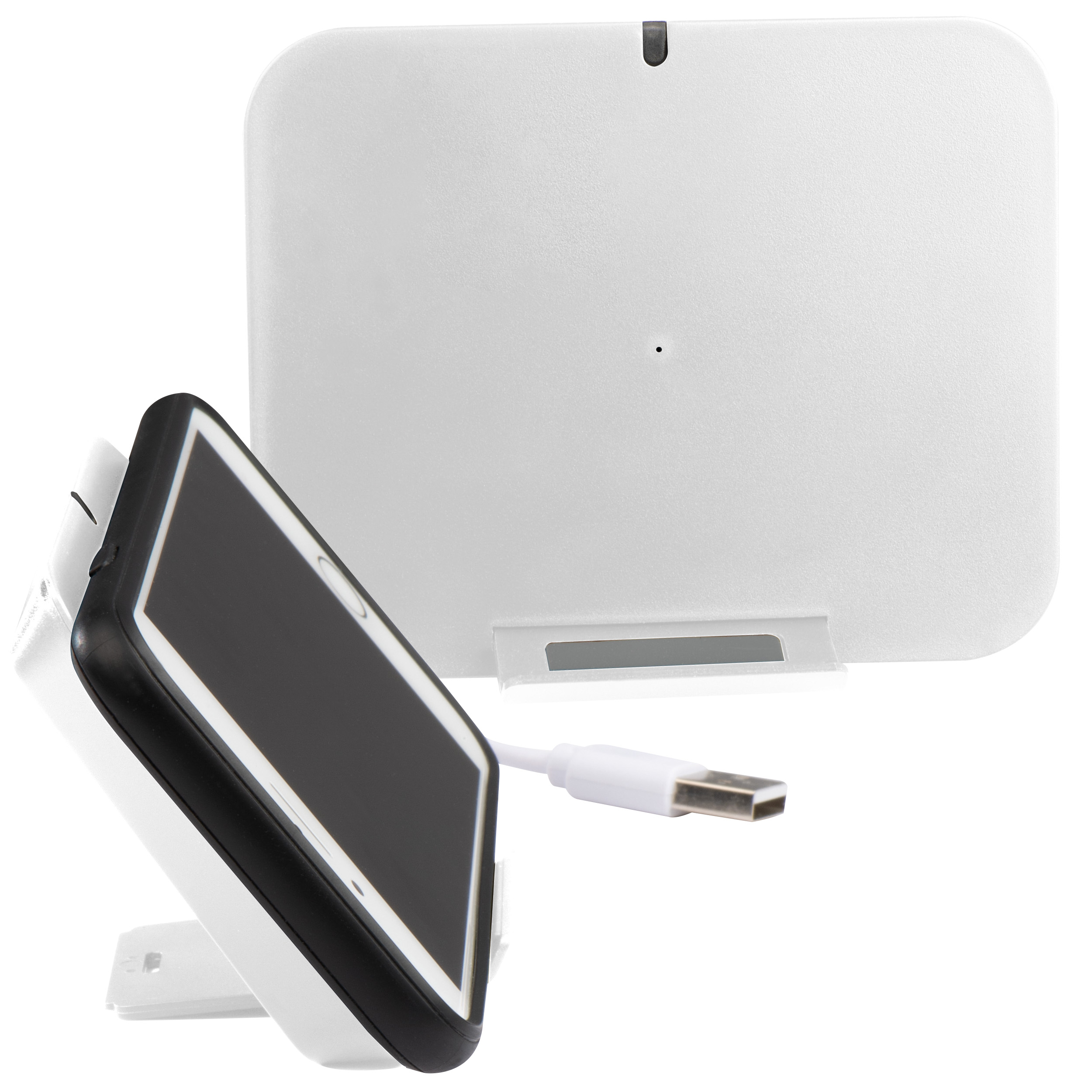 Induktionsladegerät aus Kunststoff inkl. USB-Ladekabel. Laden Sie Ihr Smartphone einfach ohne Kabelverbindung auf. Der Wireless Charger dient gleichzeitig auch als Ständer für Ihr Smartphone. Ihre Werbung drucken wir vorne mittig auf das Induktionsladegerät.