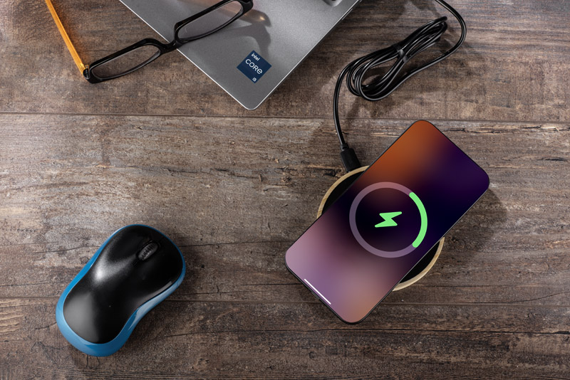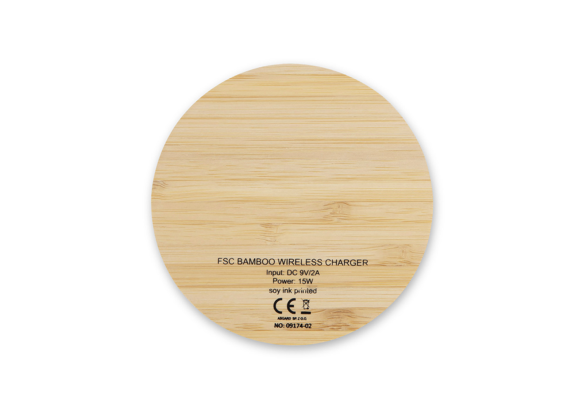 Die runde FRESTI 15W Induktionsladestation mit einem Gehäuse aus natürlichem Bambus. Dank ihres leichten und schlanken Designs ist sie handlich und ästhetisch ansprechend. Das abnehmbare schwarze Kabel sorgt für eine bequeme Nutzung. Perfekt als Werbegeschenk, das moderne Technologie mit natürlichem Design verbindet.