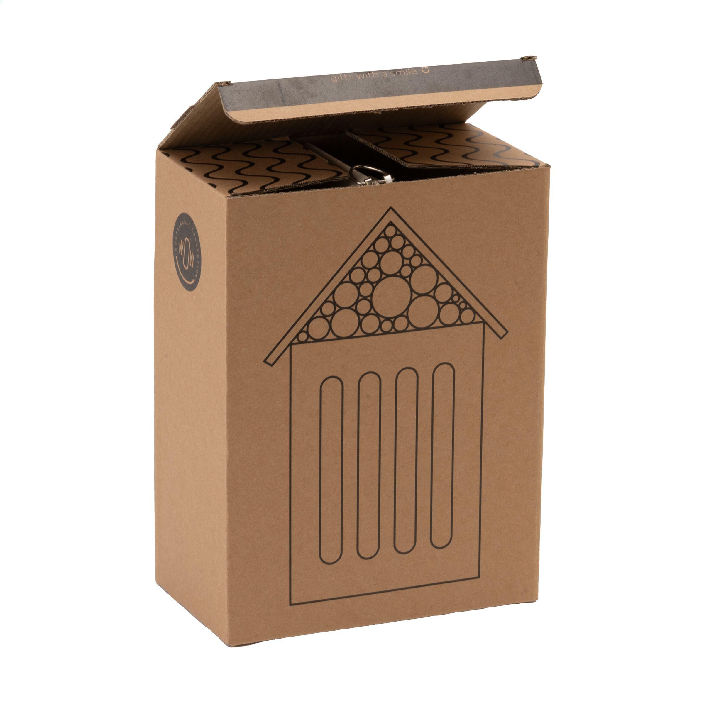 Dieses Insektenhotel aus Bambus bietet nützlichen Insekten wie Solitärbienen, Marienkäfern und Fliegen eine sichere Schutz- und Niststätte. Dank der vielfältigen Öffnungen finden mehrere Arten einen geeigneten Unterschlupf. Mit Metallaufhänger. Eine wertvolle Bereicherung für Garten oder Balkon – gut für die Artenvielfalt und die Atmosphäre.