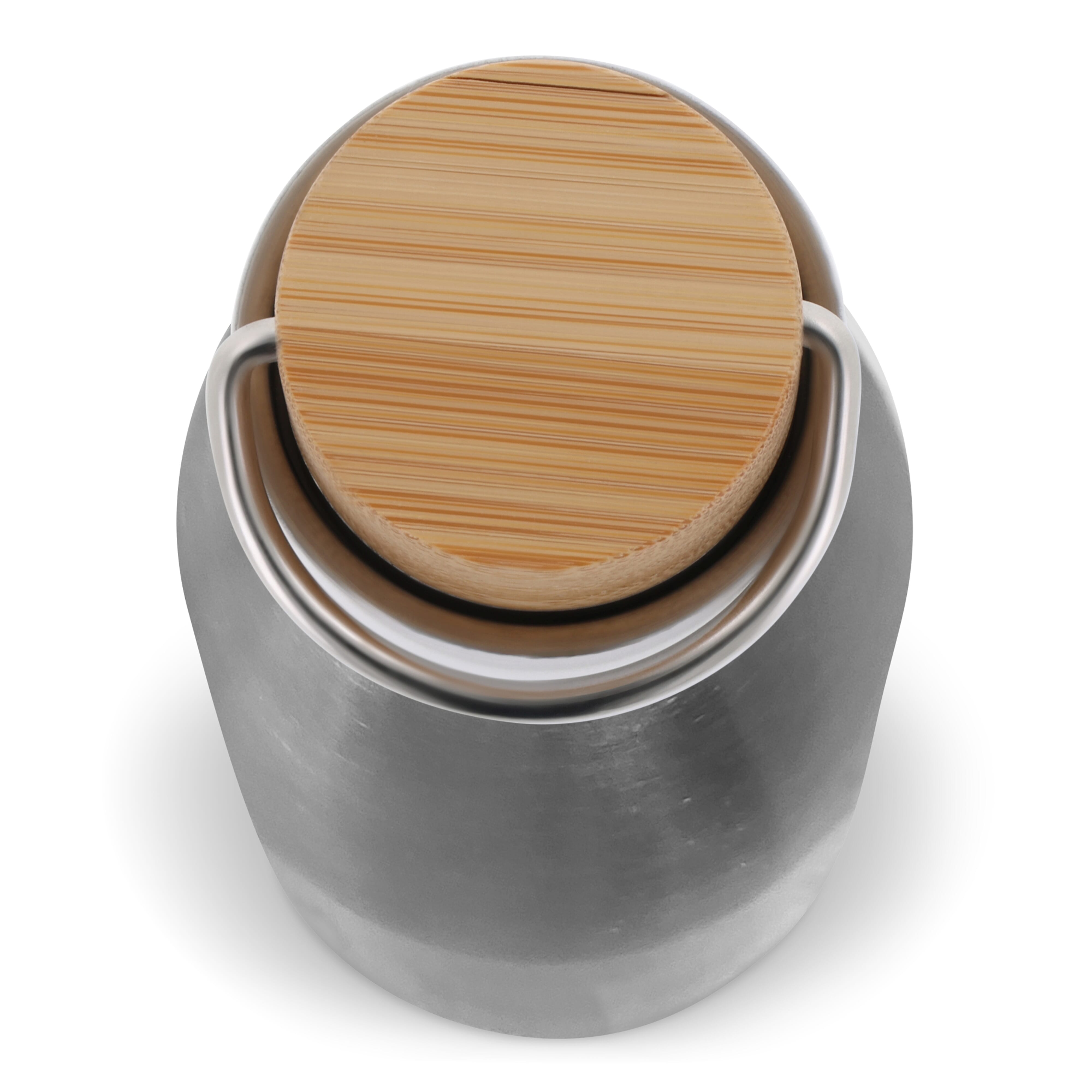 Doppelwandige Vakuum-Isolierflasche mit Holzdeckel. Mit einer matten Beschichtung für ein modernes Finish.