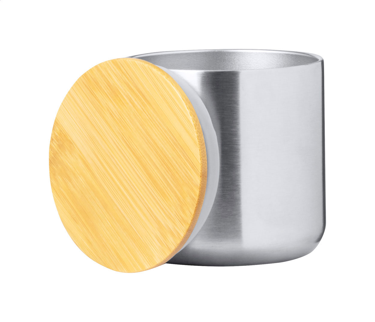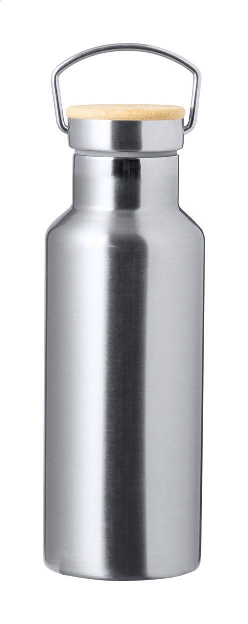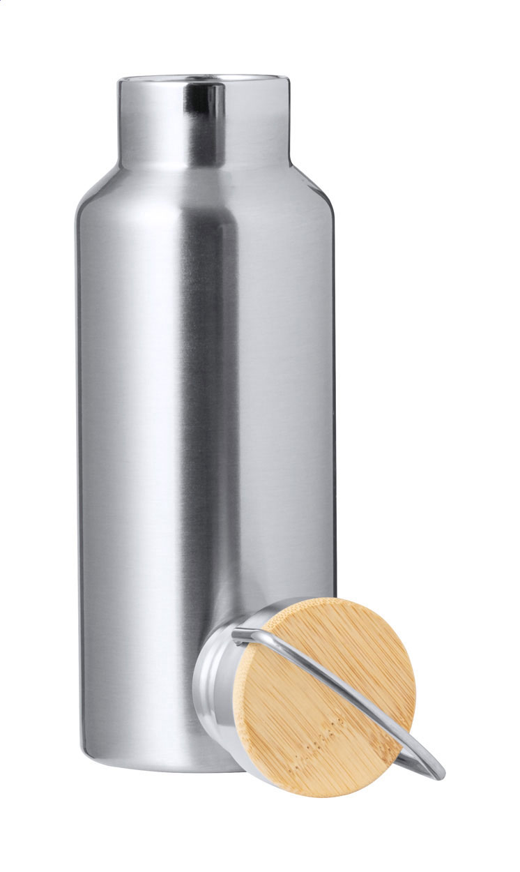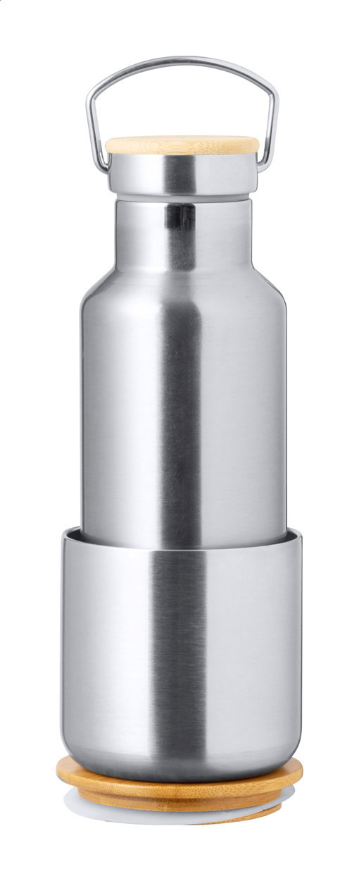 Doppelwandiges, vakuumisoliertes Trinkbehälterset aus Edelstahl. Das Set besteht aus einer Isolierflasche (500 ml) mit Bambusdeckel und Isolierbecher (300 ml). Verpackt in Kraftpapierbox.