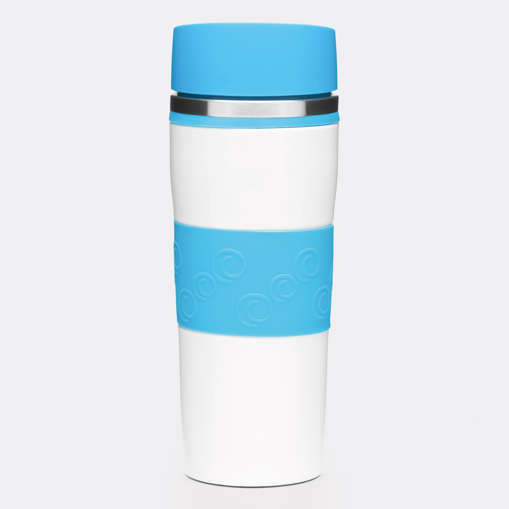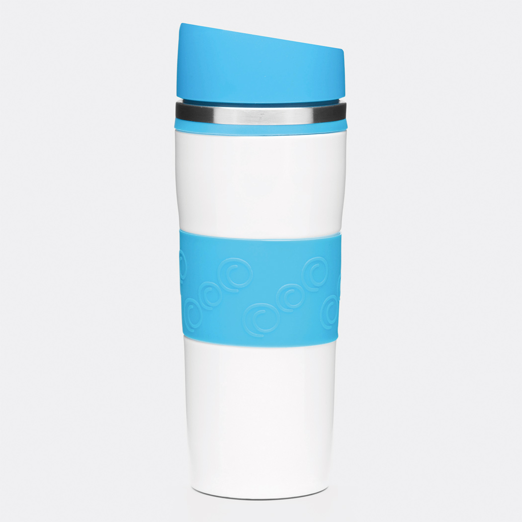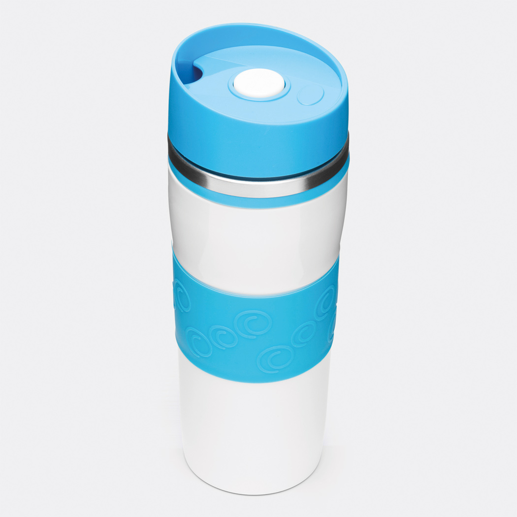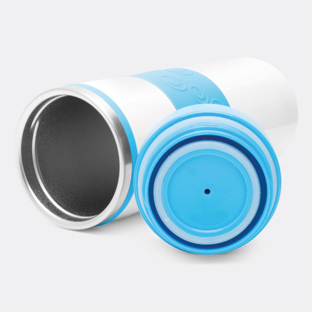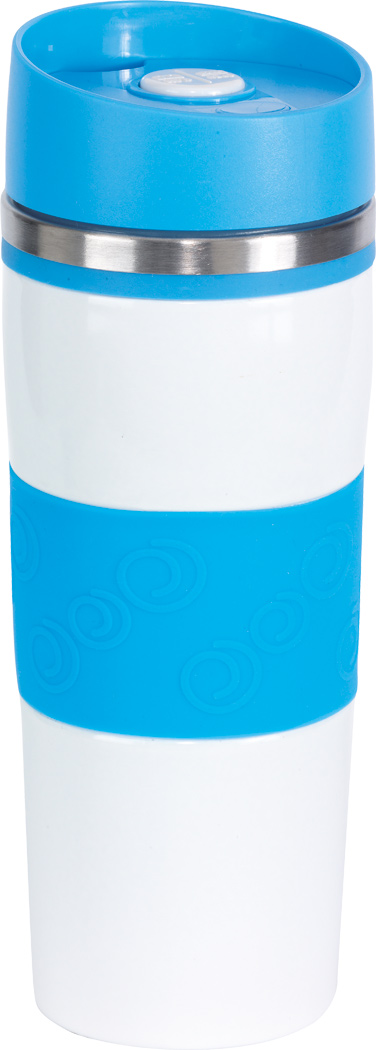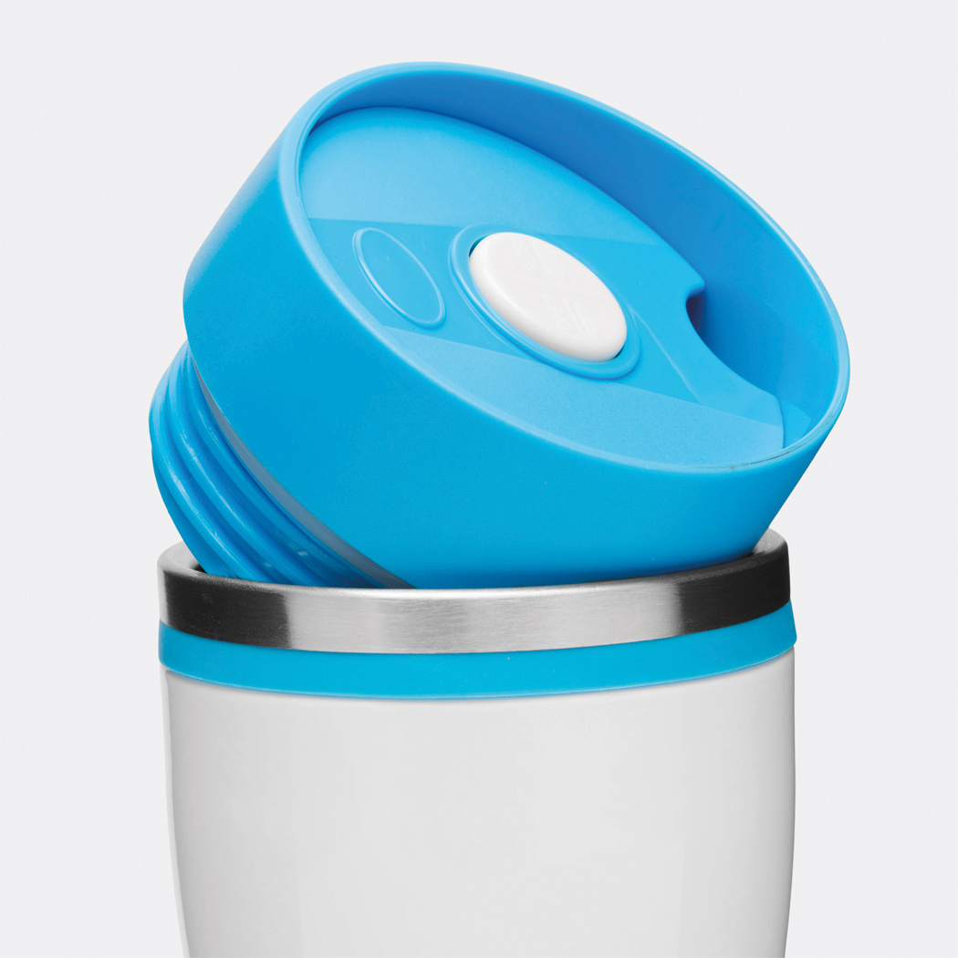 Isolierbecher ARABICA, doppelwandig: innen und außen aus Edelstahl, farbig abgesetzter Kunststoff-Deckel mit sicherem Schraubverschluss, Push-Button OPEN / CLOSE und integrierter Trinköffnung, farbige Silikon-Manschette für optimale Griffigkeit, gummierter Standfuß für gute Bodenhaftung, Füllmenge ca. 400 ml