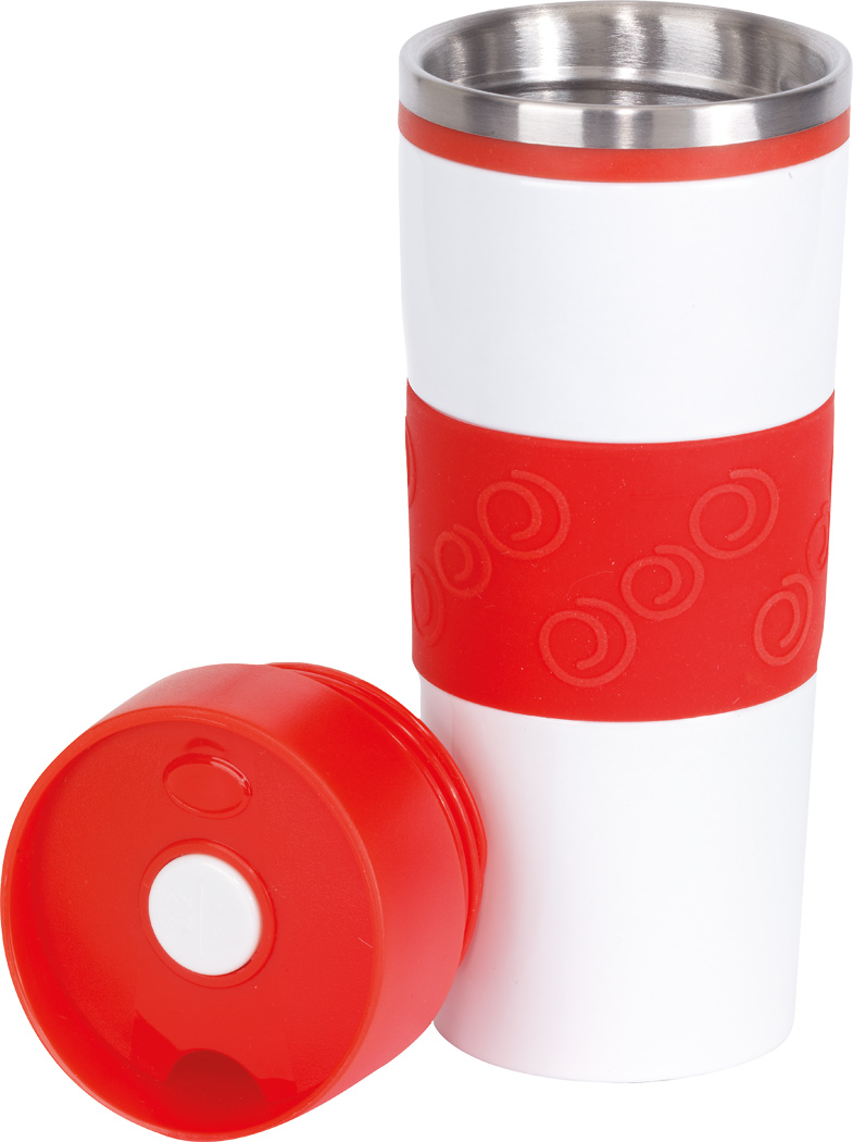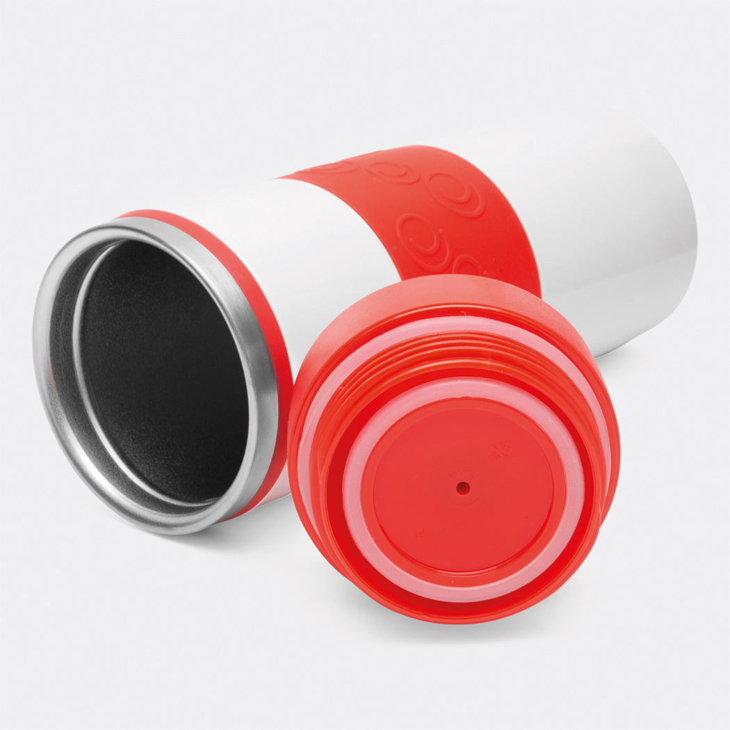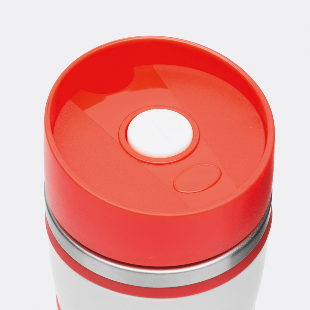 Isolierbecher ARABICA, doppelwandig: innen und außen aus Edelstahl, farbig abgesetzter Kunststoff-Deckel mit sicherem Schraubverschluss, Push-Button OPEN / CLOSE und integrierter Trinköffnung, farbige Silikon-Manschette für optimale Griffigkeit, gummierter Standfuß für gute Bodenhaftung, Füllmenge ca. 400 ml
