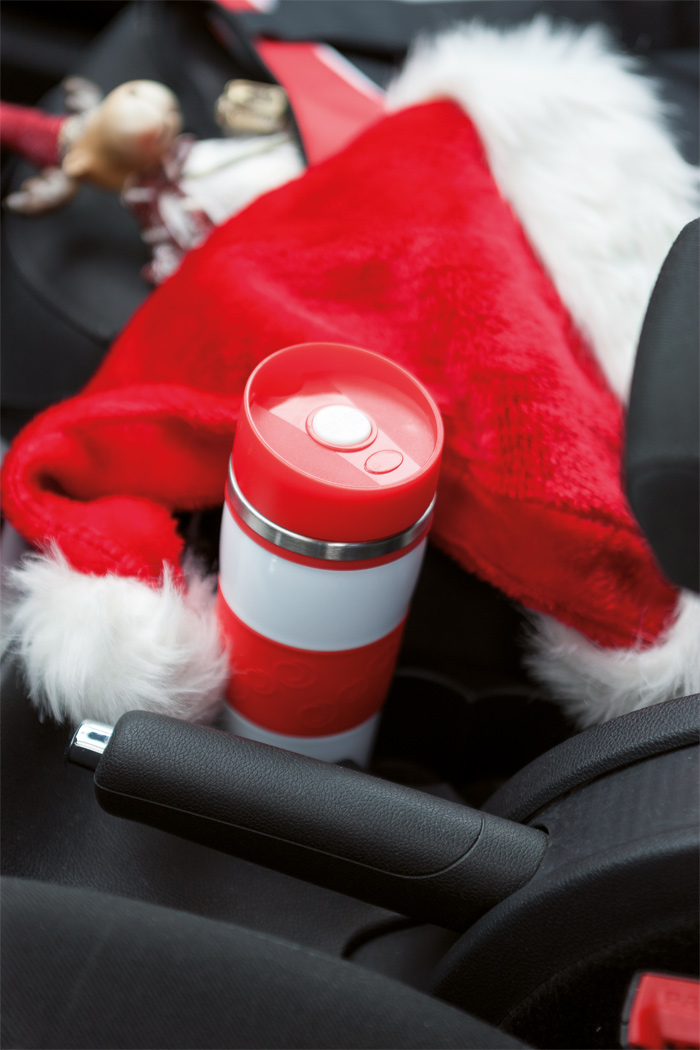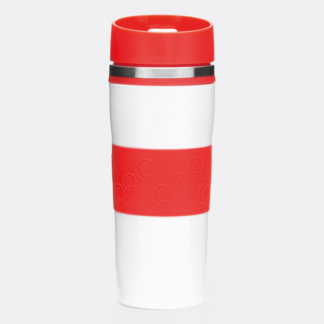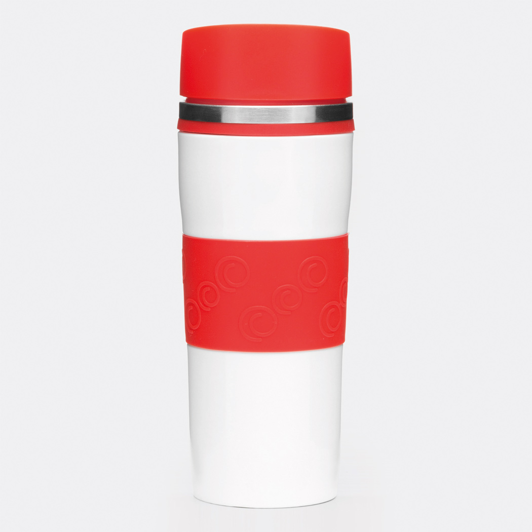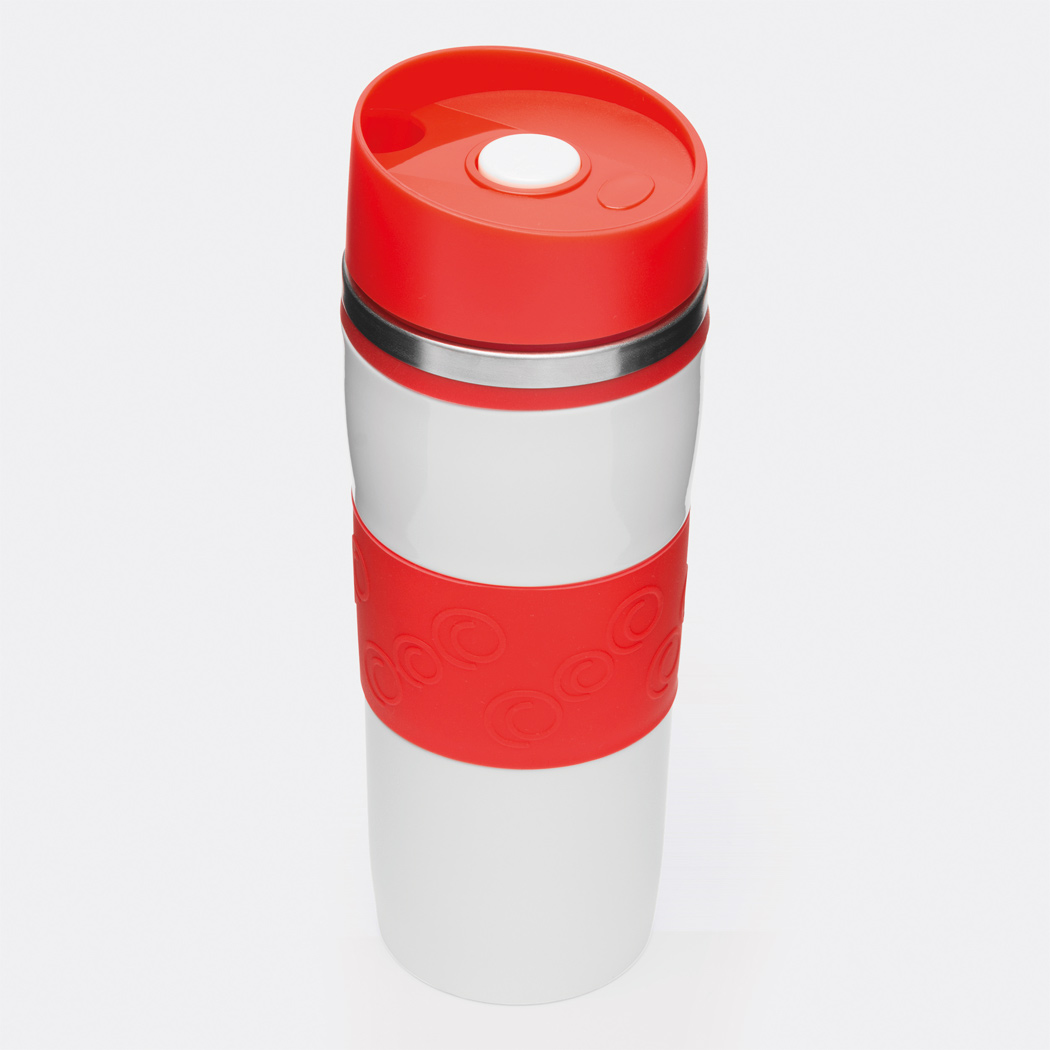 Isolierbecher ARABICA, doppelwandig: innen und außen aus Edelstahl, farbig abgesetzter Kunststoff-Deckel mit sicherem Schraubverschluss, Push-Button OPEN / CLOSE und integrierter Trinköffnung, farbige Silikon-Manschette für optimale Griffigkeit, gummierter Standfuß für gute Bodenhaftung, Füllmenge ca. 400 ml