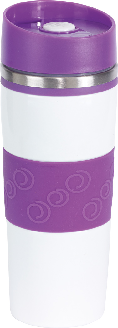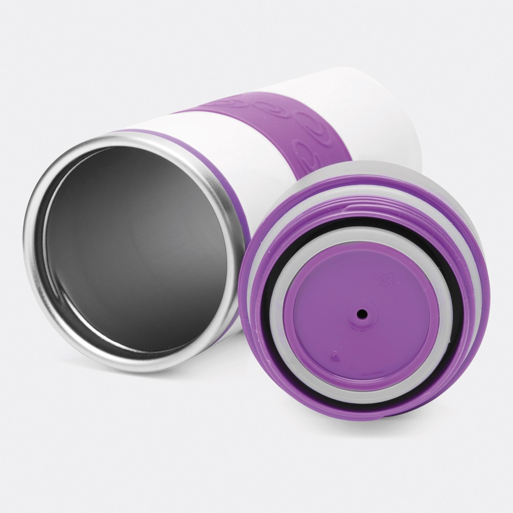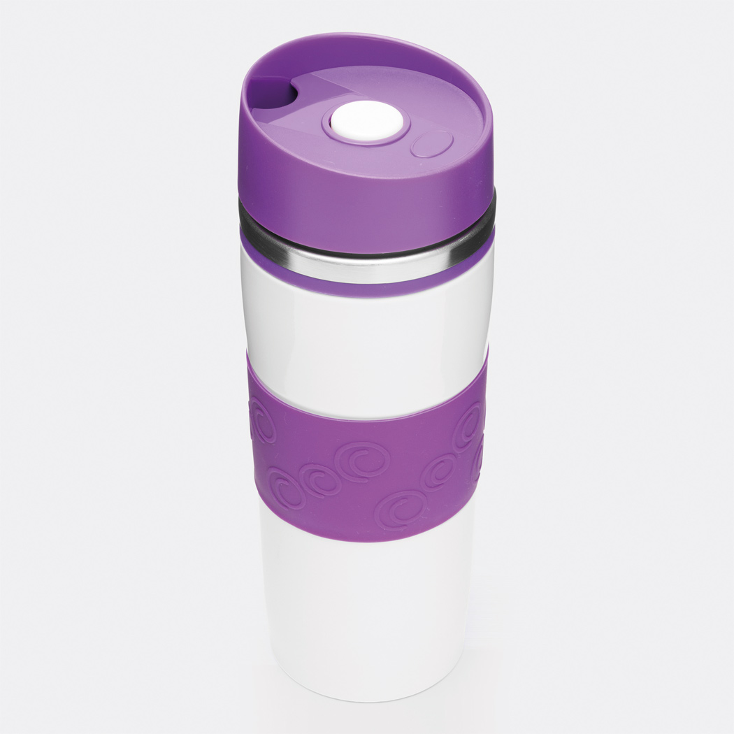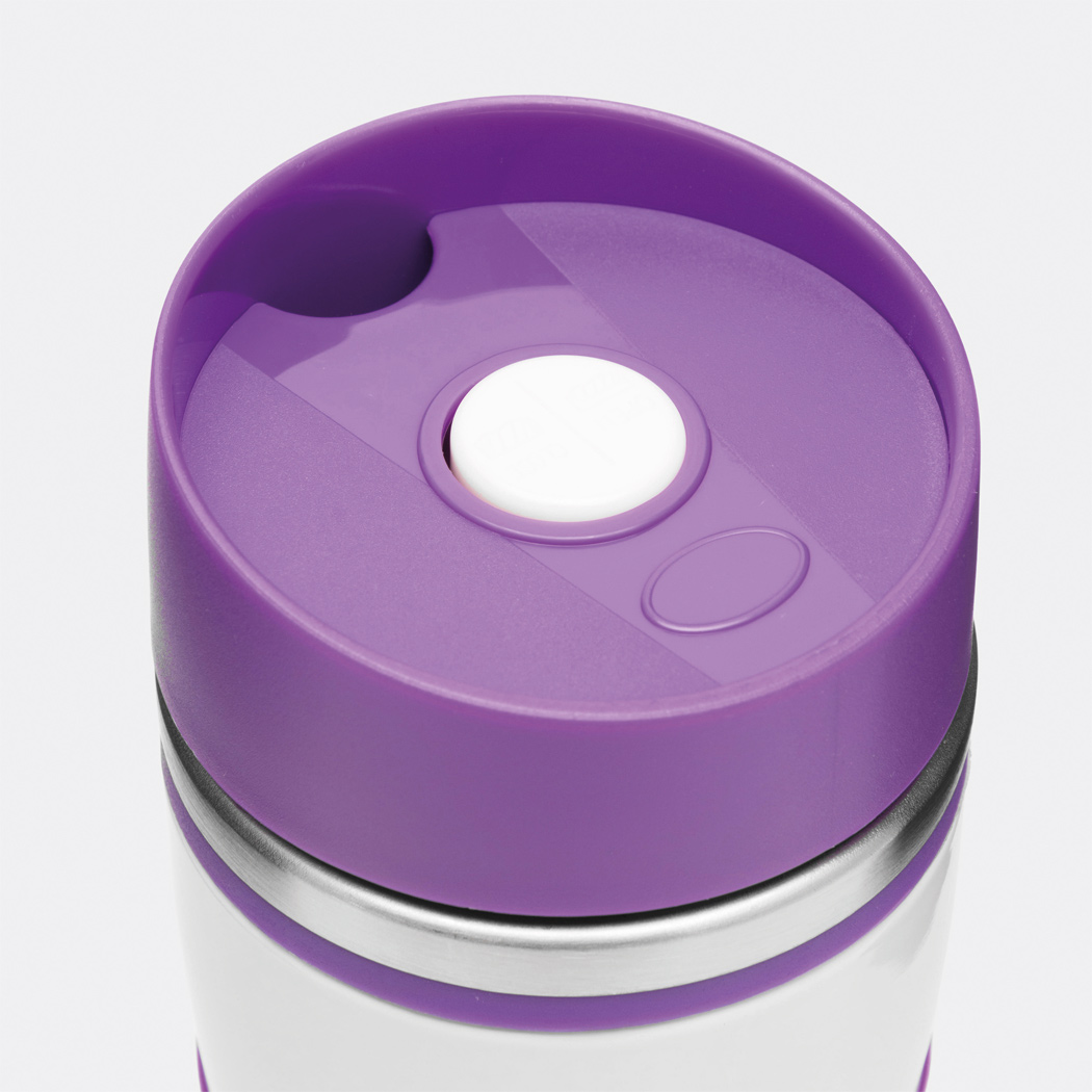 Isolierbecher ARABICA, doppelwandig: innen und außen aus Edelstahl, farbig abgesetzter Kunststoff-Deckel mit sicherem Schraubverschluss, Push-Button OPEN / CLOSE und integrierter Trinköffnung, farbige Silikon-Manschette für optimale Griffigkeit, gummierter Standfuß für gute Bodenhaftung, Füllmenge ca. 400 ml