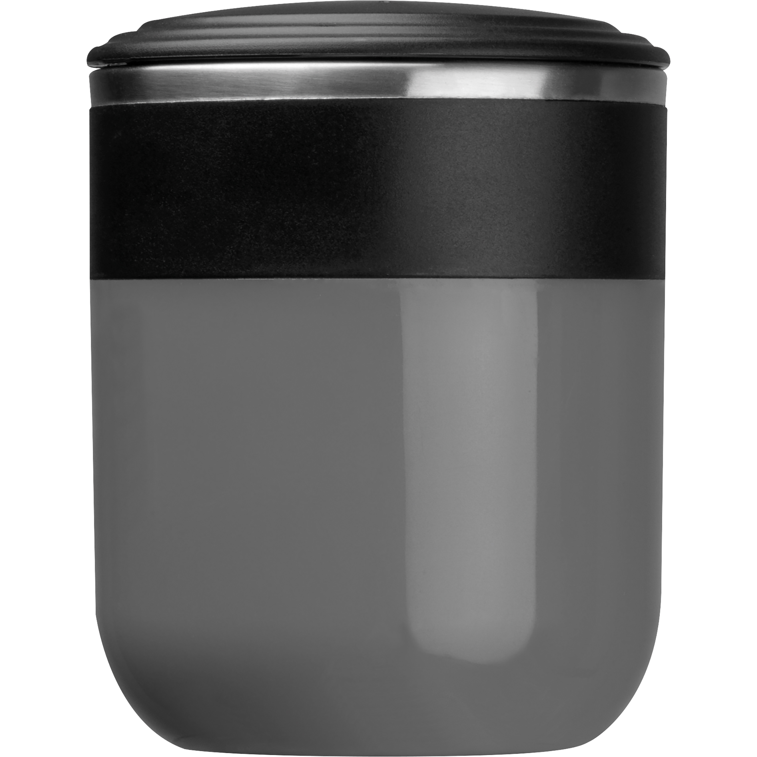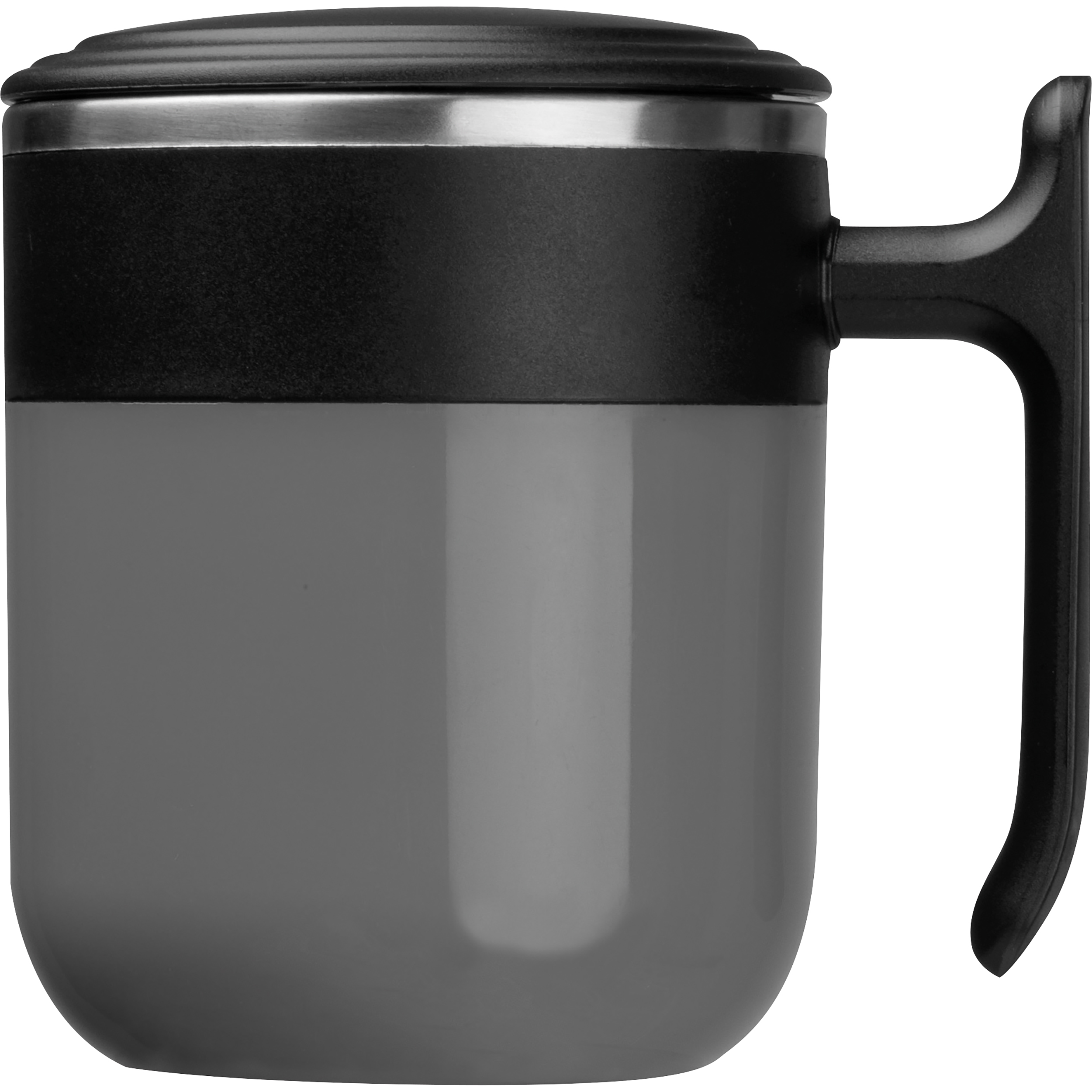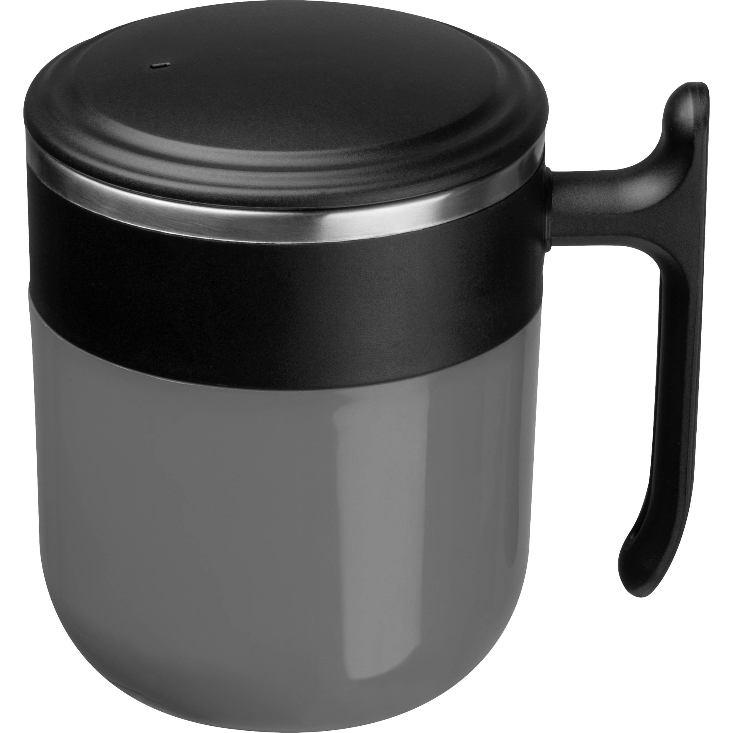Doppelwandiger Isolierbecher aus Edelstahl mit rutschfestem Boden, Haltegriff und einem Füllvermögen von 300 ml. Ihre Werbung wird auf den Becher gedruckt.
