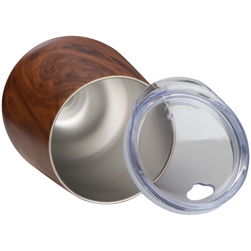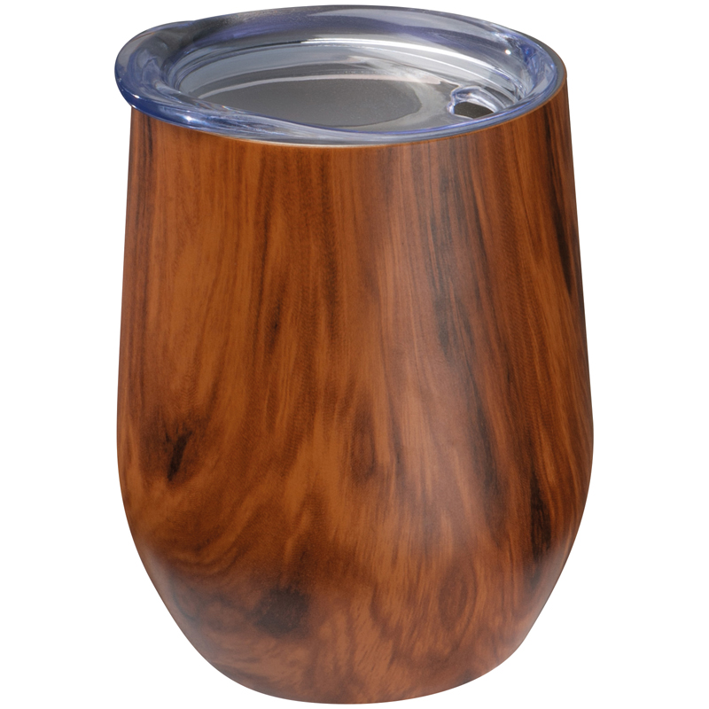 Doppelwandiger Isolierbecher aus Edelstahl mit Vakuum in Holzoptik und einem Fassungsvermögen von 380 ml - Ihre Werbung lasern wir auf den Becher.