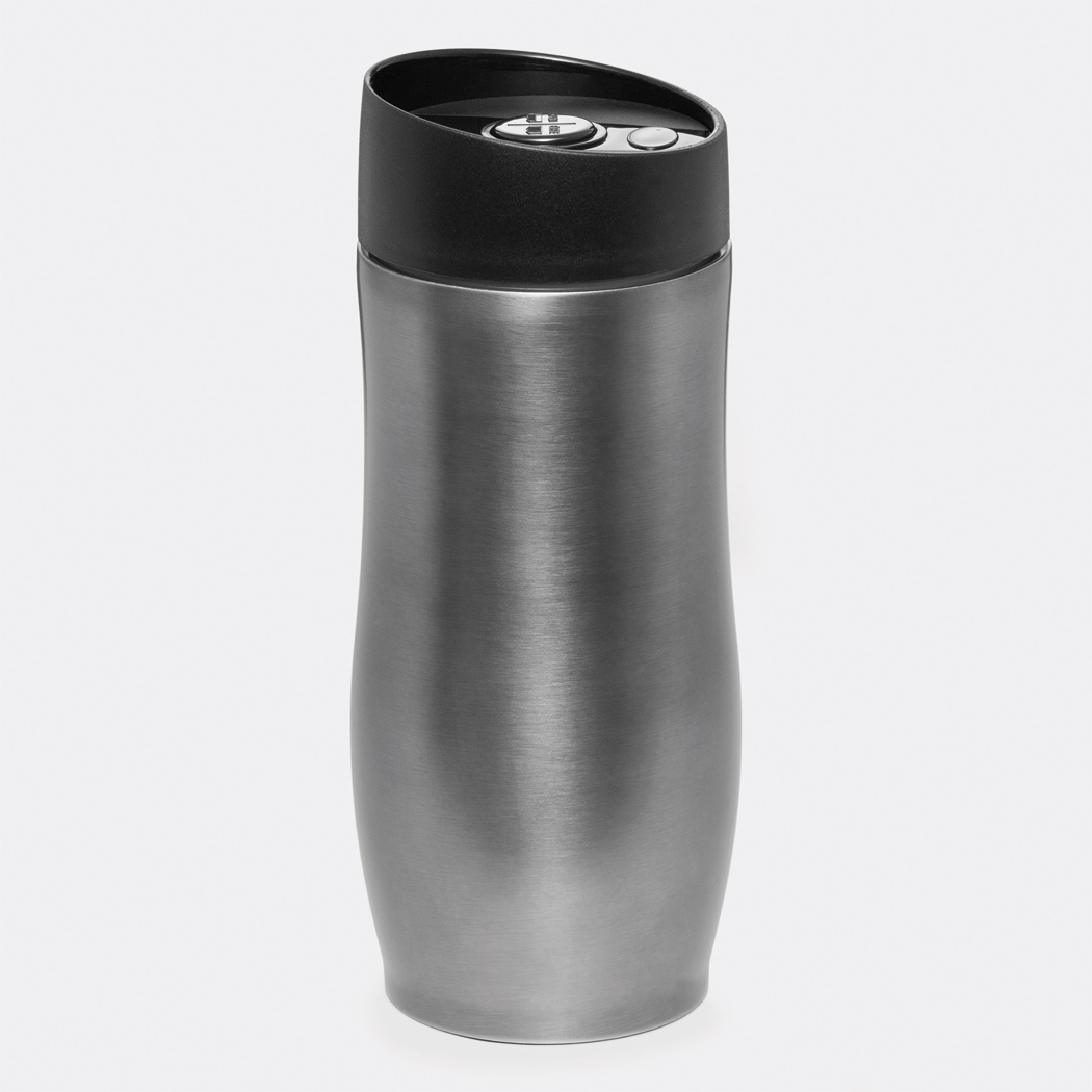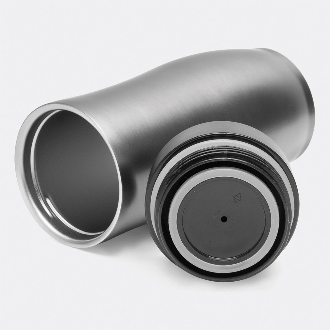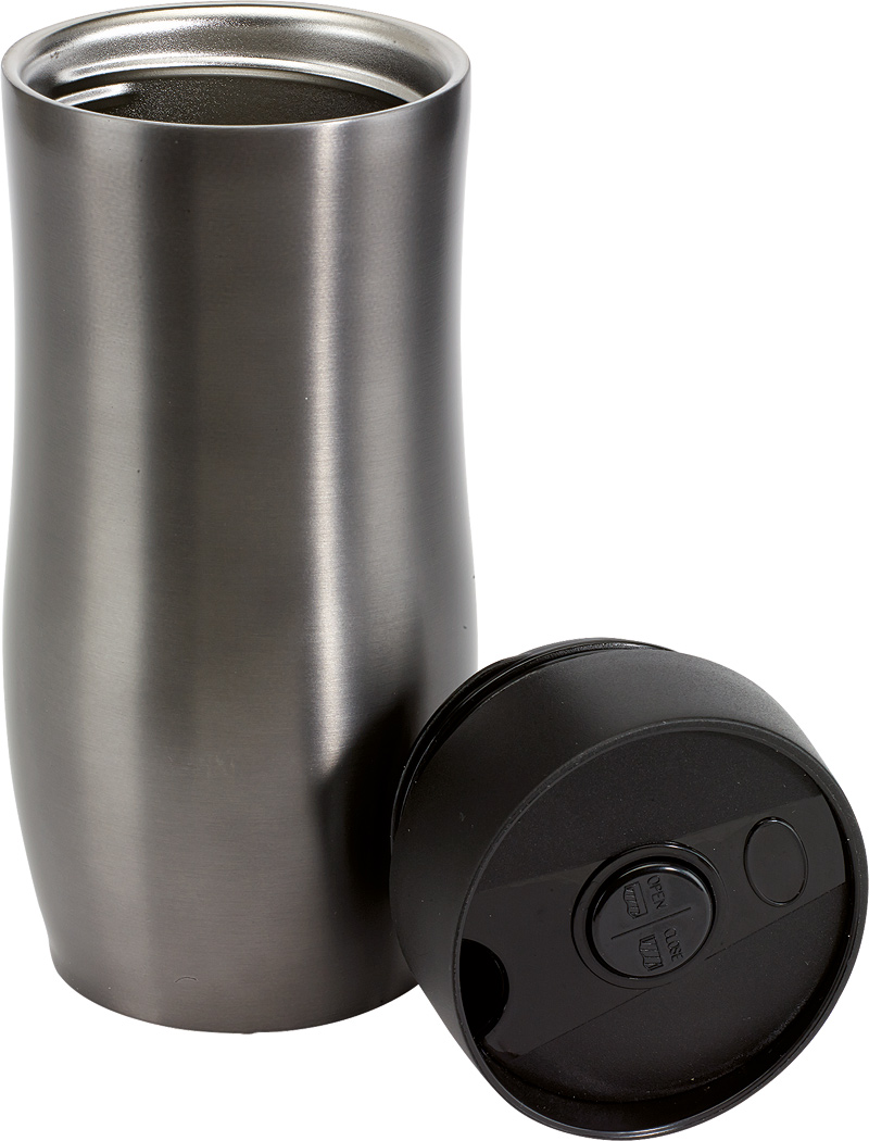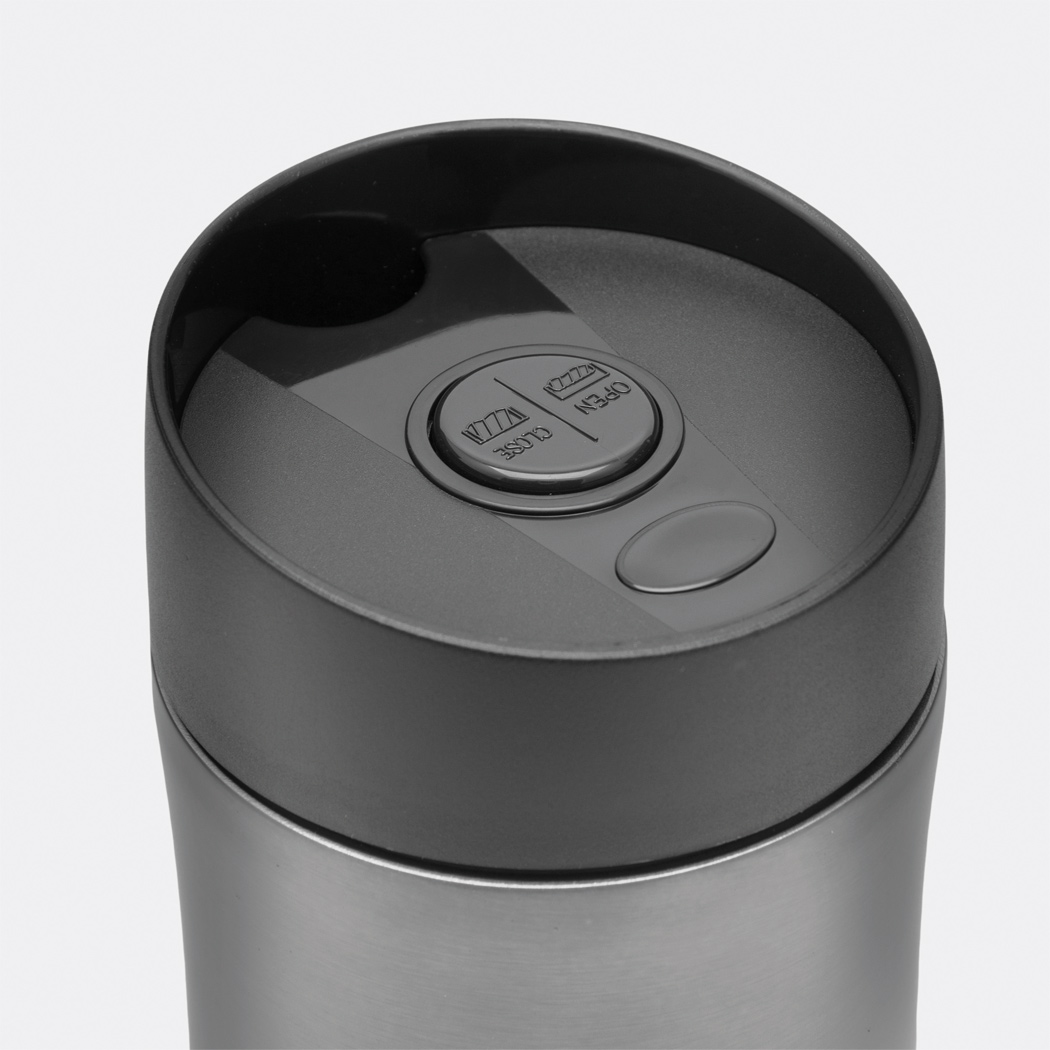Isolierbecher CLASSICO, doppelwandig: innen und außen aus Edelstahl, Kunststoff-Deckel mit sicherem Schraubverschluss, Push-Button OPEN / CLOSE und integrierter Trinköffnung, gummierter Standfuß für gute Bodenhaftung, Füllmenge ca. 380 ml