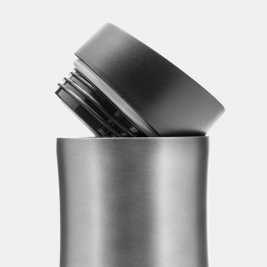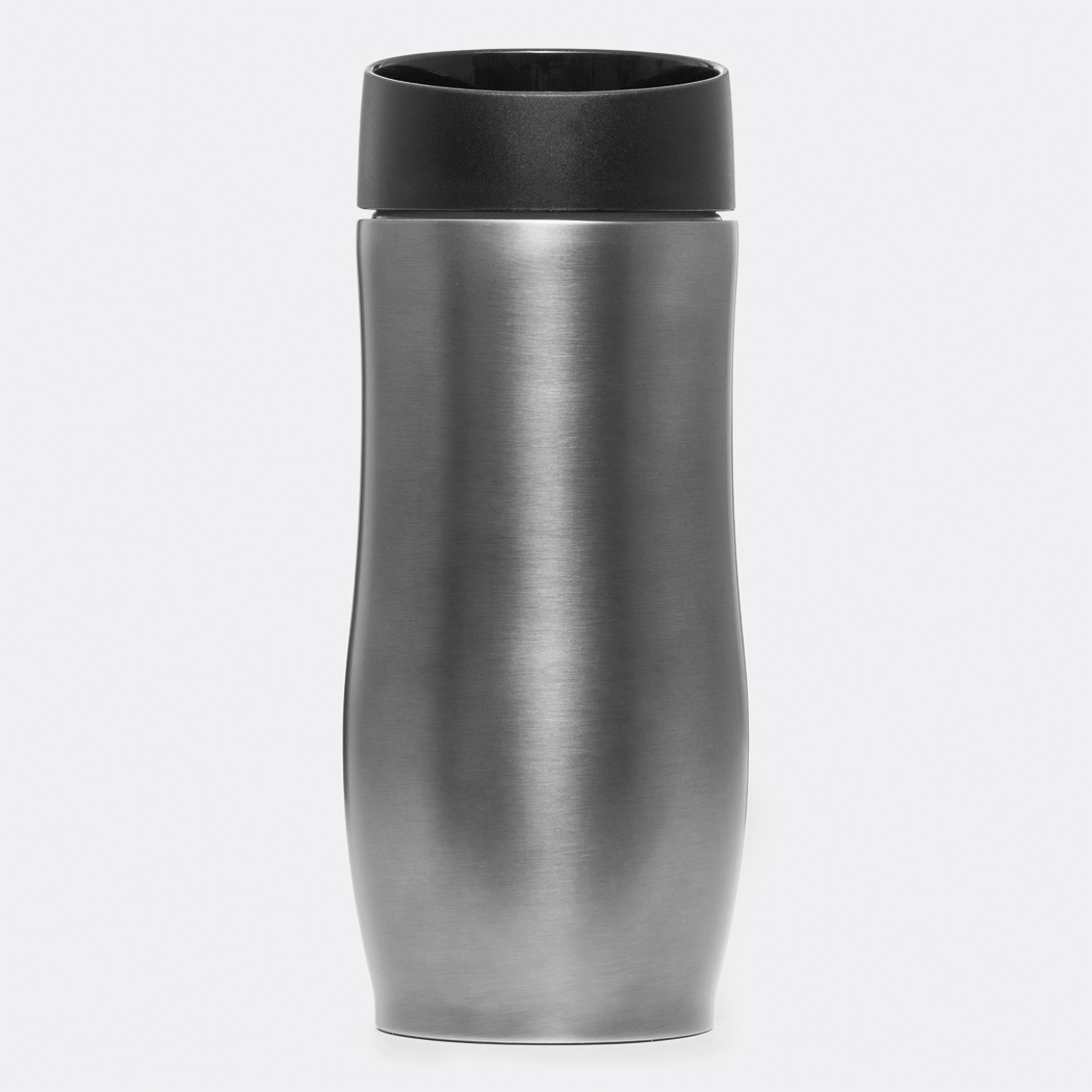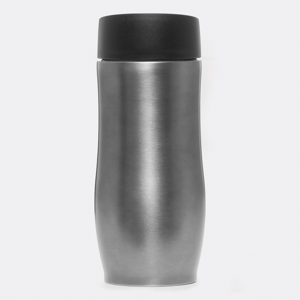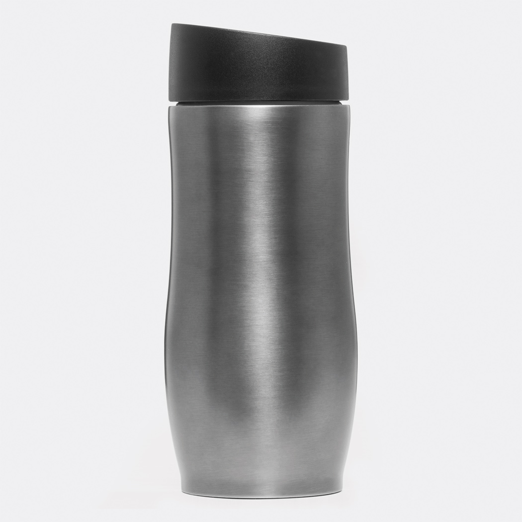 Isolierbecher CLASSICO, doppelwandig: innen und außen aus Edelstahl, Kunststoff-Deckel mit sicherem Schraubverschluss, Push-Button OPEN / CLOSE und integrierter Trinköffnung, gummierter Standfuß für gute Bodenhaftung, Füllmenge ca. 380 ml
