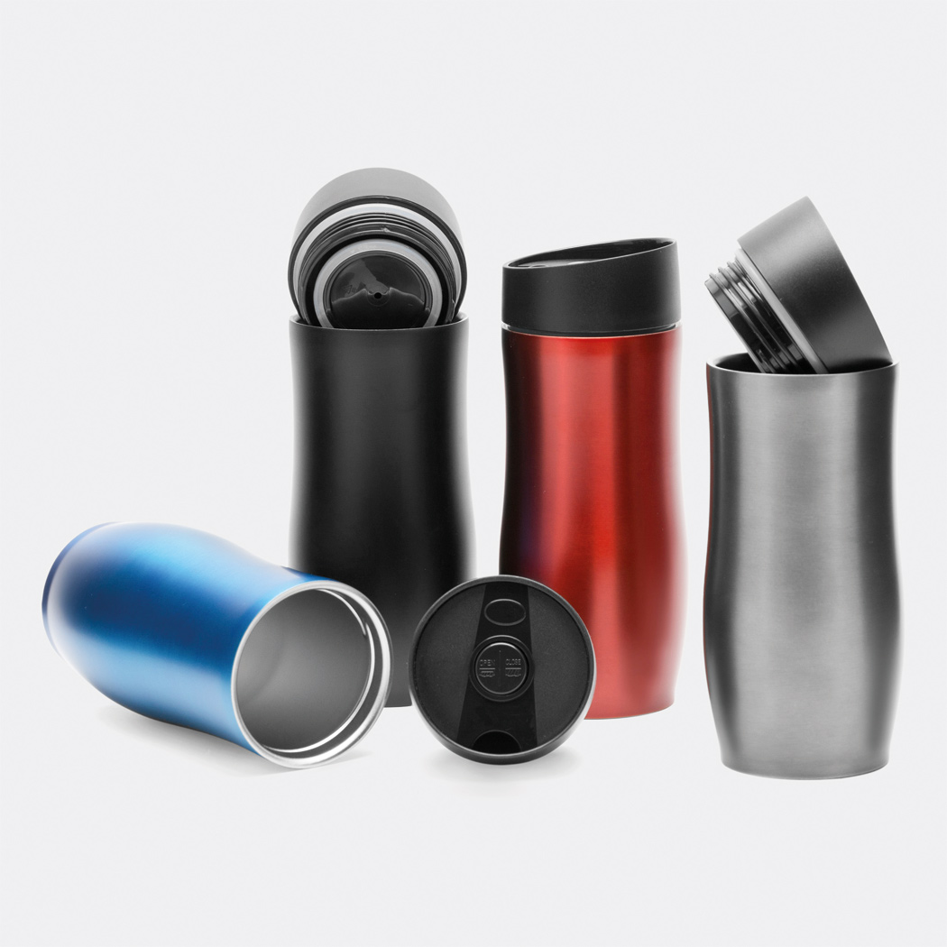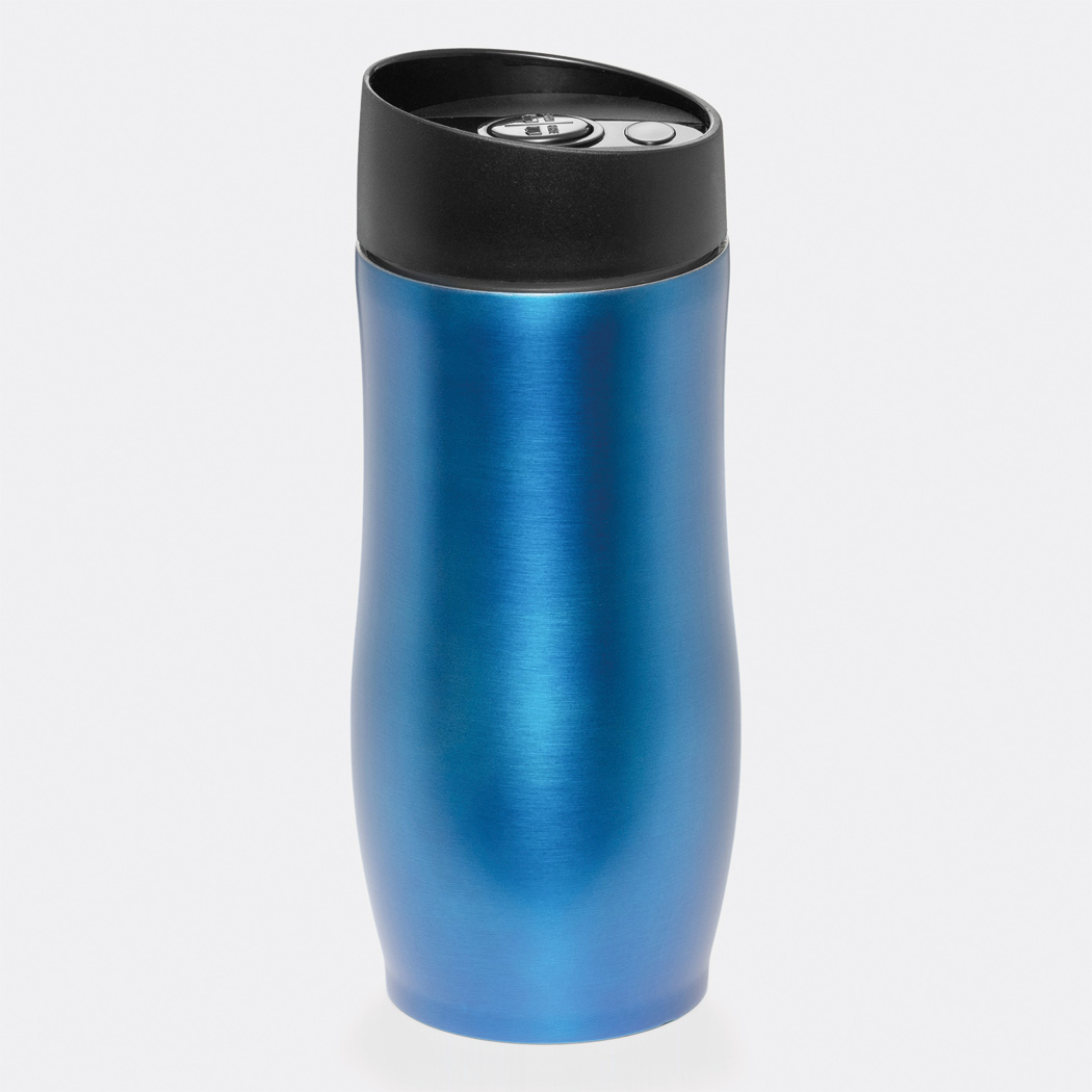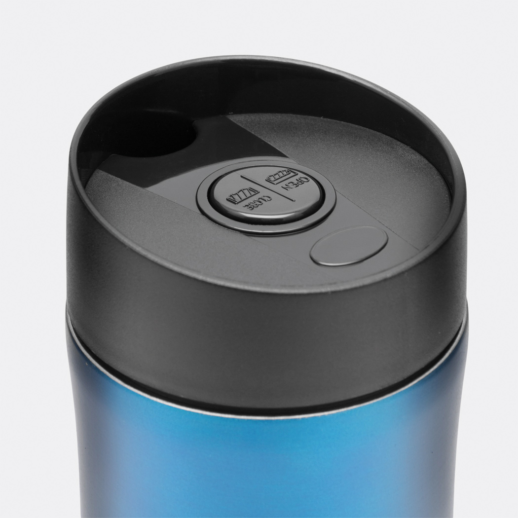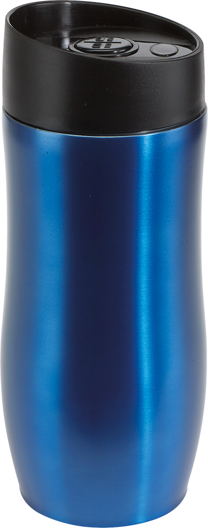 Isolierbecher CLASSICO, doppelwandig: innen und außen aus Edelstahl, Kunststoff-Deckel mit sicherem Schraubverschluss, Push-Button OPEN / CLOSE und integrierter Trinköffnung, gummierter Standfuß für gute Bodenhaftung, Füllmenge ca. 380 ml