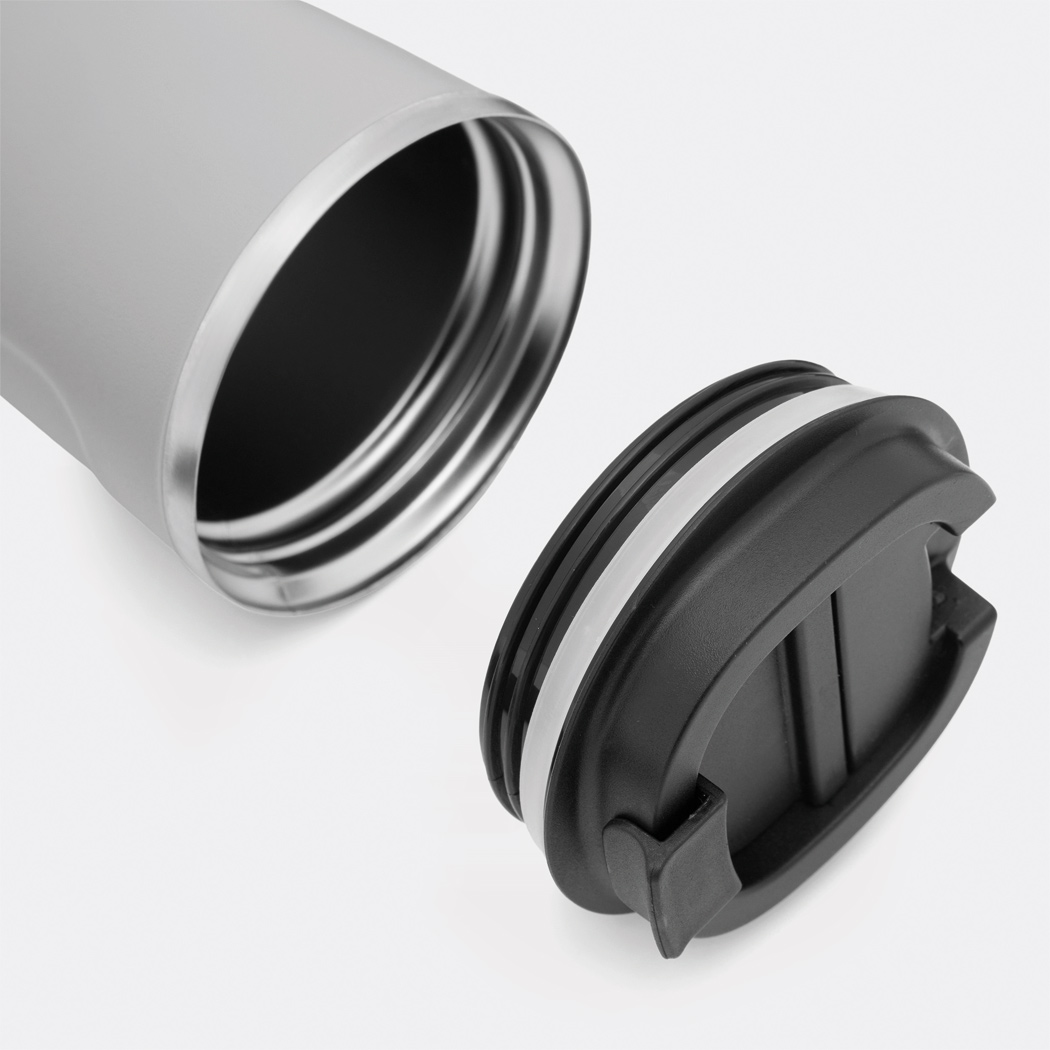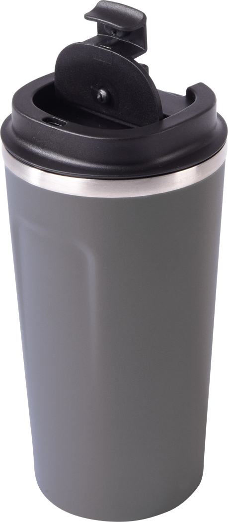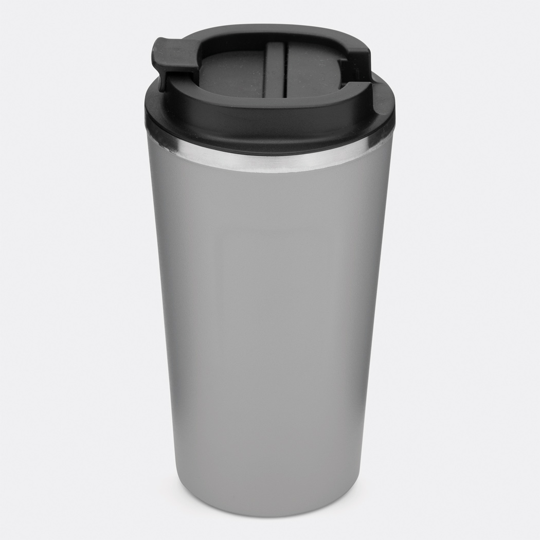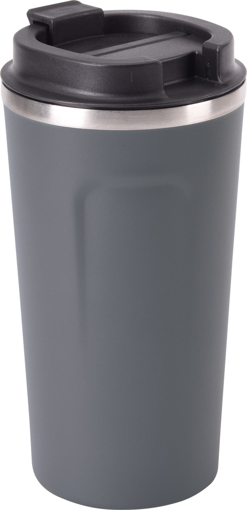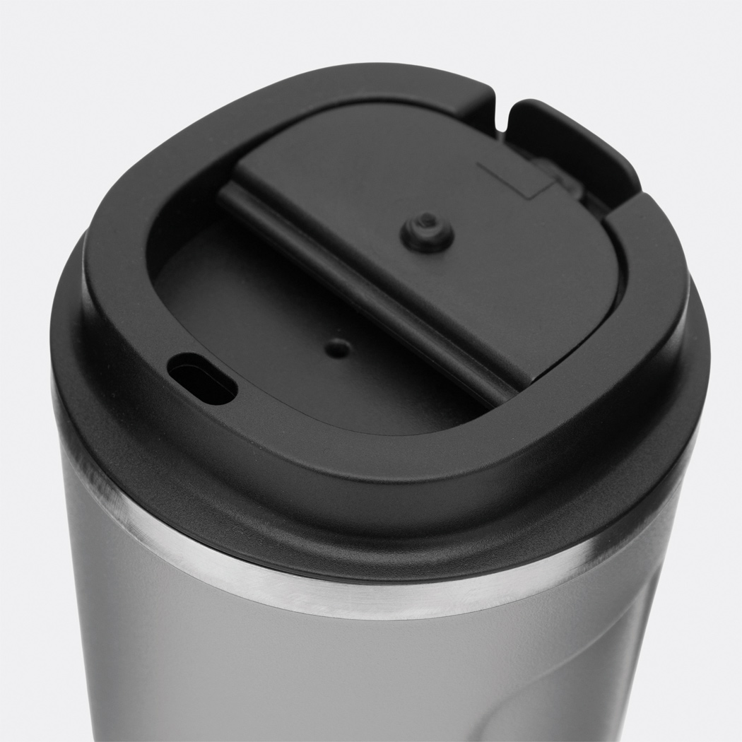 Vakuum-Isolierbecher COFFEE TIME, doppelwandig: innen und außen aus Edelstahl, schwarzer Kunststoff-Deckel mit sicherem Schraubverschluss, Silikon-Dichtring und integrierter Trinköffnung zum Aufklappen, Füllmenge ca. 500 ml, hält ca. 8 Stunden warm und bis zu 12 Stunden kalt, in Box