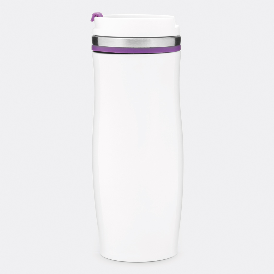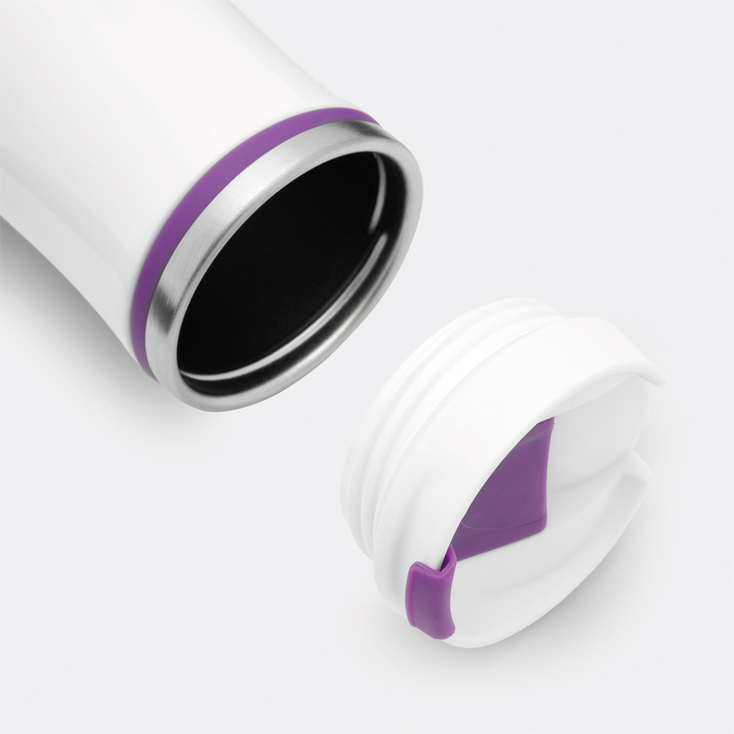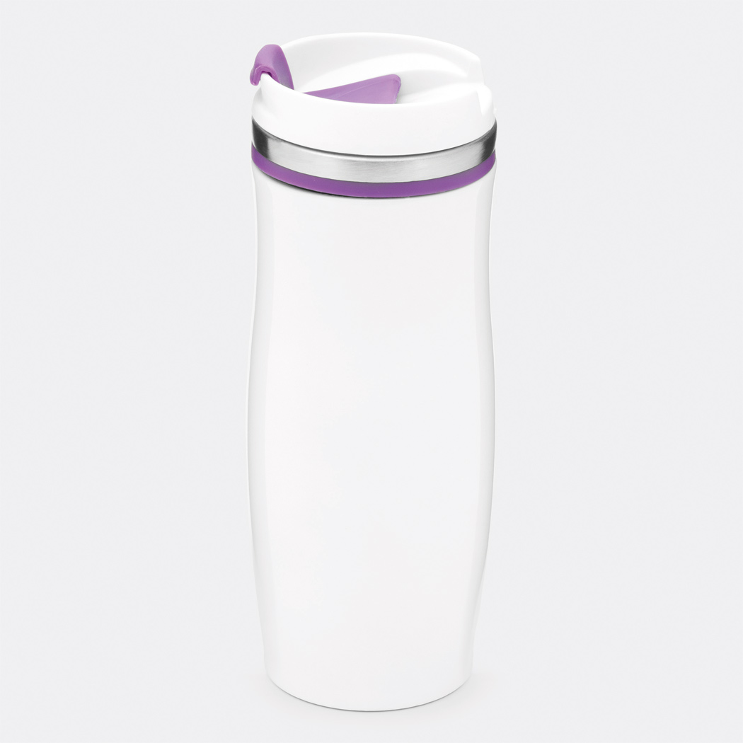 Isolierbecher CREMA, doppelwandig: innen und außen aus Edelstahl, Kunststoff-Deckel mit sicherem Schraubverschluss und integrierter Trinköffnung zum Aufklappen, farbig-gummierte Manschette oben sowie gummierter Standfuß für gute Bodenhaftung, Füllmenge ca. 400 ml