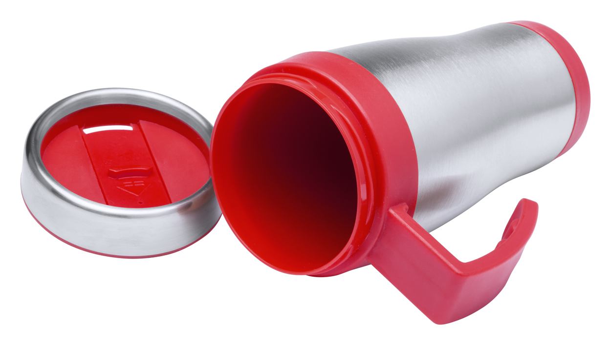 Doppelwandiger Isolierbecher aus Edelstahl mit farbigen Kunststoffteilen. Füllmenge: 450 ml. Einzeln in Geschenkbox.